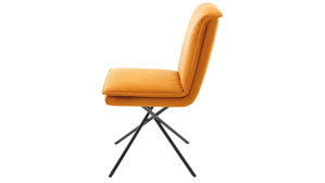 sonnengelber Lederbezug mit einer beigen Kontrastnaht und mattschwarzen Metallfüßen