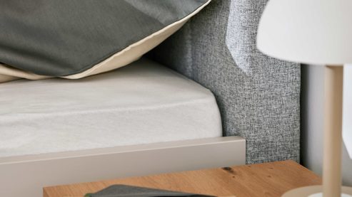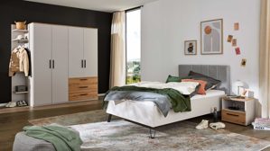 Das Programm ist flexibel anpassbar und sogar mit Maßkürzungen in Höhe, Breite und Tiefe erhältlich. Durchdachte Stauraumlösungen mit variablen Schrankbreiten, cleveren Innenausstattungen und praktischem Zubehör sorgen für Ordnung im Alltag. Ergänzend lassen sich ergonomische Arbeitsbereiche planen – optional auch mit höhenverstellbarem Schreibtisch. Unterschiedliche Bettgestelle, Stauraum-, Duo- oder Kastenliegen ermöglichen maximale Flächennutzung.