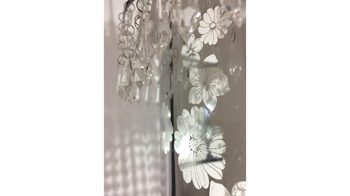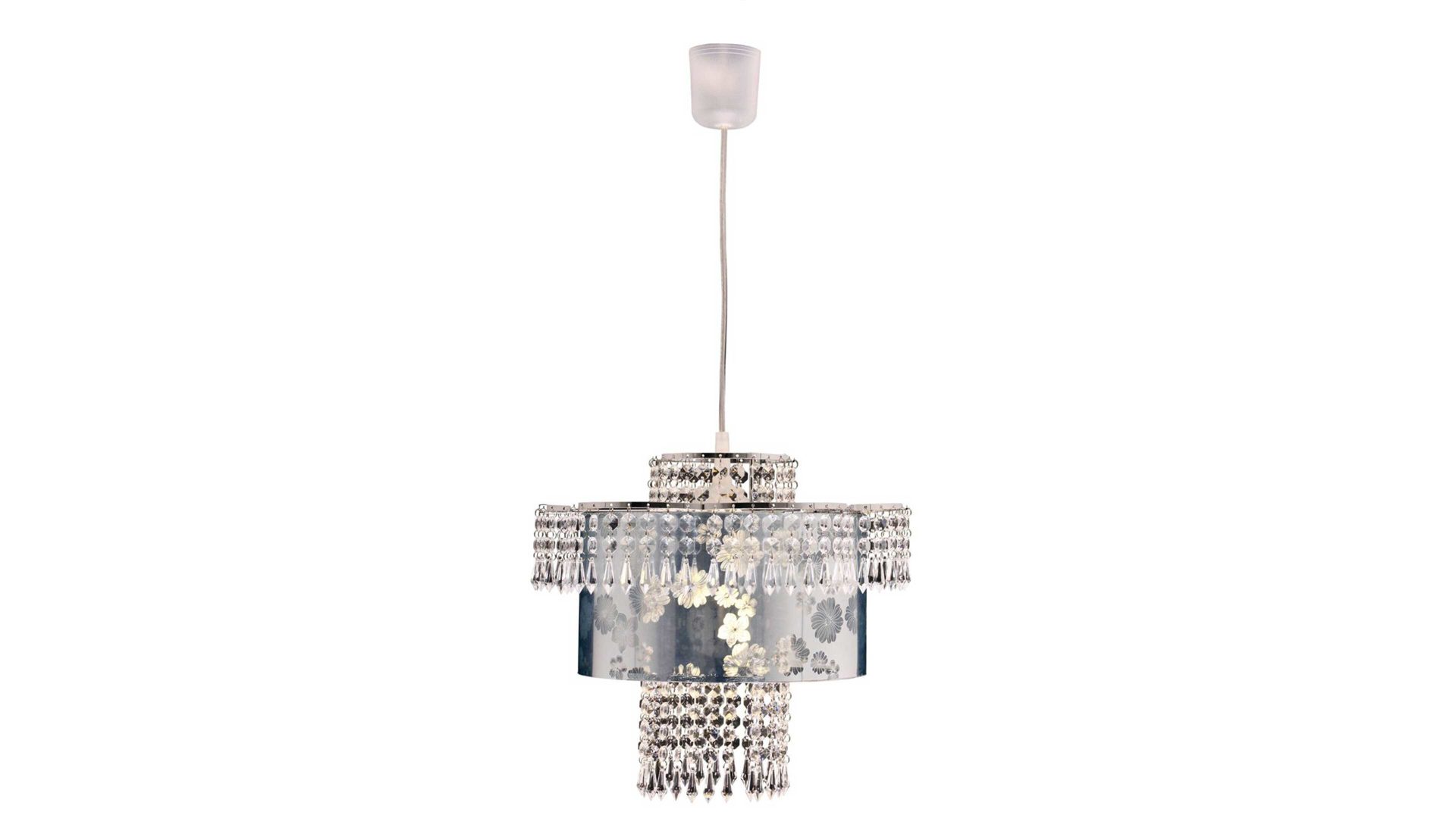 Sie offenbart einen chromfarbenen Metall-Lampenschirm mit floralem Muster und ein Gehänge aus Acrylglas, das zweifelsohne als optisches Highlight fungiert. Alles in allem präsentiert sich die Hängelampe außergewöhnlich komponiert. Durch die ausgeprägte Eleganz setzt sie in jedem Raum einen noblen Akzent.