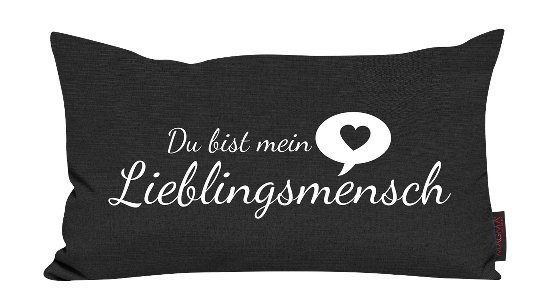 Liebevolle Botschaft für die beste Freundin: Mit dem MAGMA Kissen sagen Sie Ihren Liebsten, wie wichtig sie Ihnen sind. Auf dem Kissen steht in weißer Schrift Du bist meine Lieblingsmensch. Ein Herz in einer Sprechblase rundet das Design ab. Dadurch, dass der Bezug in dunklem Anthrazit überzeugt, fällt der Schriftzug besonders auf. Legen Sie das Kissen mit den Maßen von ca. 30 x 50 cm (BxL) auf Ihre Couch oder den Fernsehsessel oder nutzen Sie es als kreative sowie persönliche Geschenkidee.