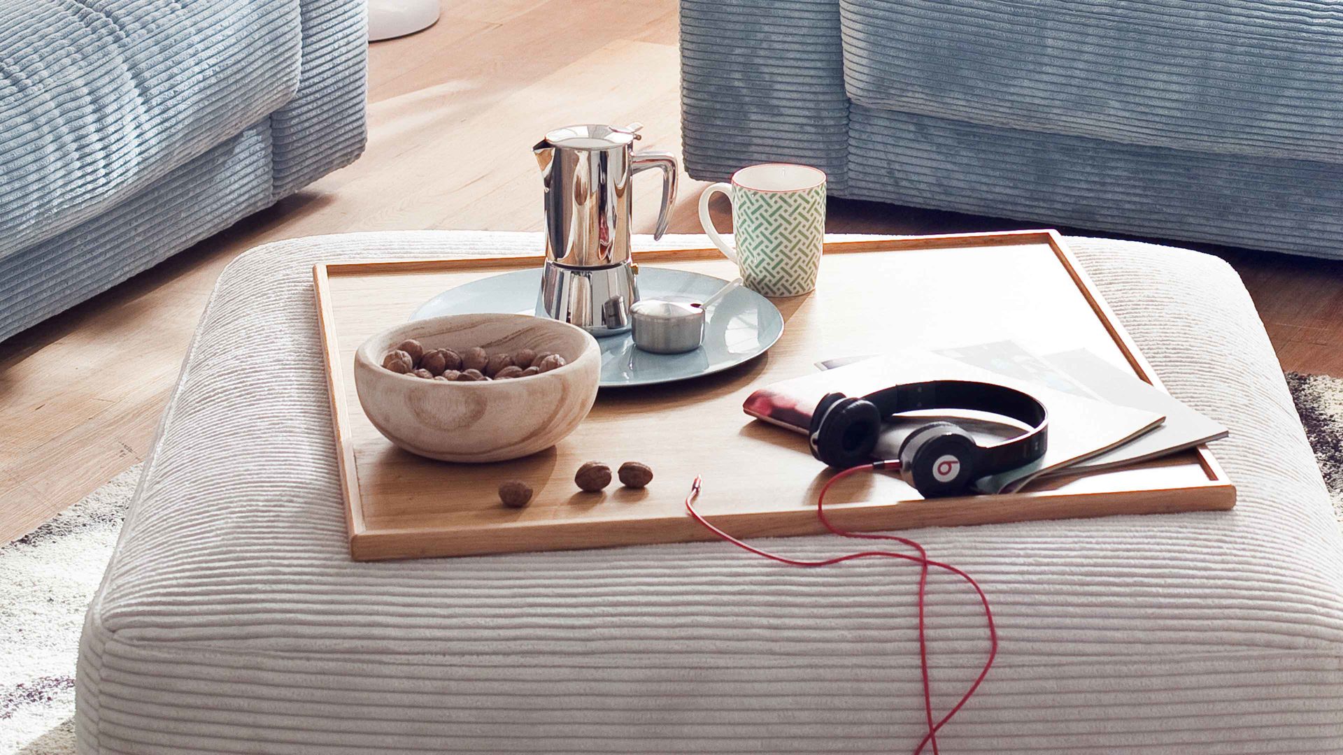Kissen und Armlehn-Tablett sowie weitere dargestellte Einrichtungsgegenstände sind separat gegen Mehrpreis bestellbar.