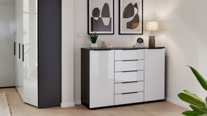 Mit Maßen von ca. 120 x 82 x 46 cm (B/LxHxT) bietet sie großzügigen Stauraum und eine klare Aufteilung. Rechts befindet sich eine Tür mit zwei höhenverstellbaren Einlegeböden, ideal für gefaltete Kleidung oder größere Accessoires. Links findest du fünf Schubladen, die mit Soft-Abstoppung und Selbsteinzug ausgestattet sind – sie schließen leise, sanft und komfortabel.
