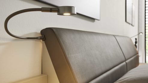 Für gezieltes Licht sorgt das zweiteilige Flexleuchten-Set (Typ 006101) aus schieferfarbenem Metall, seitlich am Kopfteil montiert. Maße: ca. 50 × 2 × 4 cm (LxHxT). Die fest verbauten LED-Leuchtmittel der Energieeffizienzklasse G (Spektrum A bis G) bieten punktgenaue Beleuchtung – ideal zum Lesen oder Entspannen.