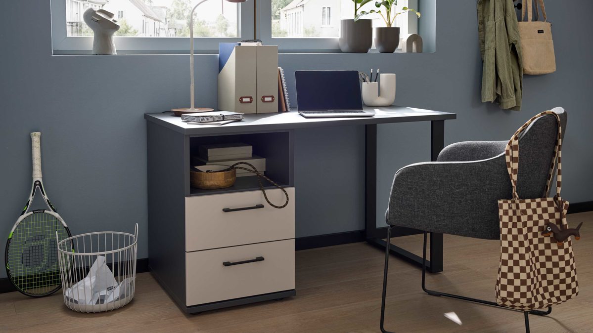 Links befindet sich ein schon fertig montierter Container mit offenem Fach und zwei Schubladen, der dir vielseitigen Stauraum für Bücher, Unterlagen und Arbeitsmaterialien bietet. Die Schubladen mit Soft-Stop-Einzug schließen angenehm leise und sorgen für zusätzlichen Komfort im Alltag.