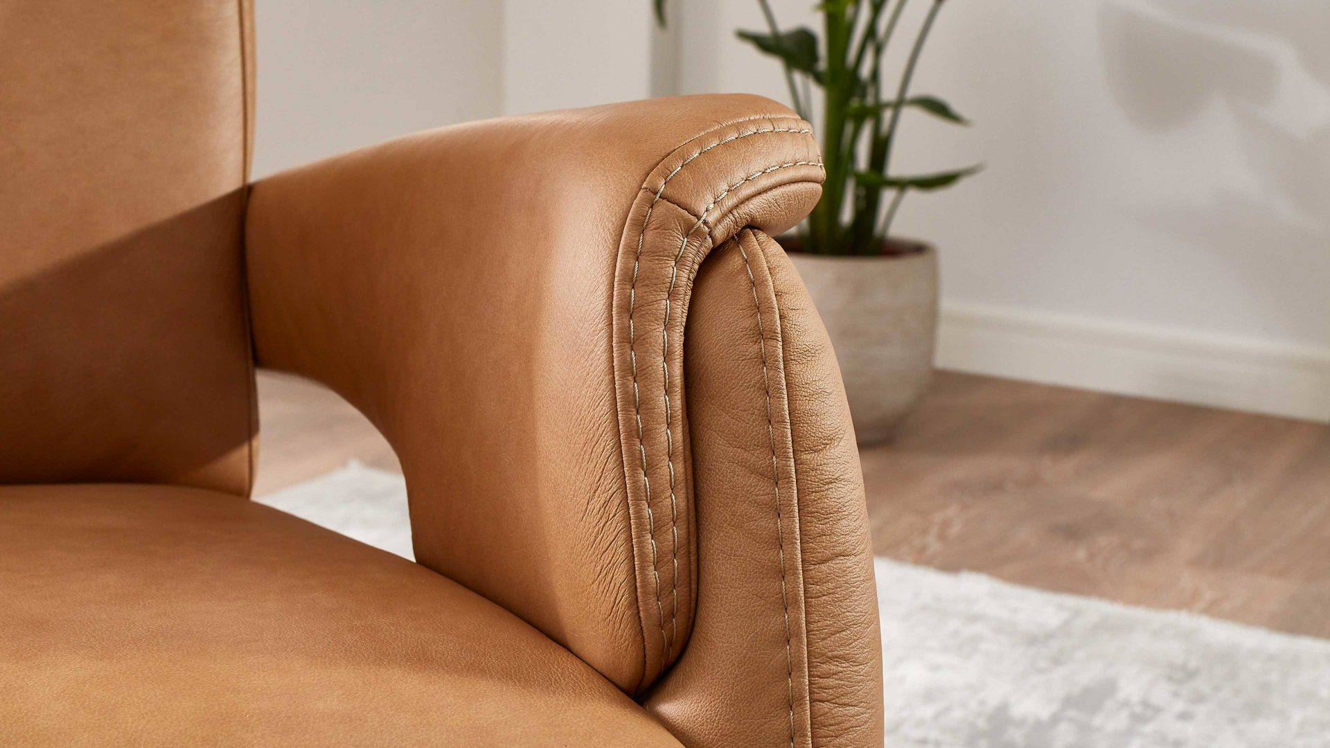 Der Relaxsessel aus dem hochwertigen Polsterprogramm OrthoSedis 6.0 ist mit edlem honigfarbenen Leder bezogen. Ein robuster mattschwarz lackierter Metall-Sternfuß sorgt für einen stabilen Stand. Sowohl die Materialien als auch die Farben harmonieren perfekt und verleihen dem TV-Sessel eine moderne und elegante Ausstrahlung. Durch das zeitlose Design fügt er sich in verschiedene Einrichtungsstile passend ein.
