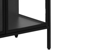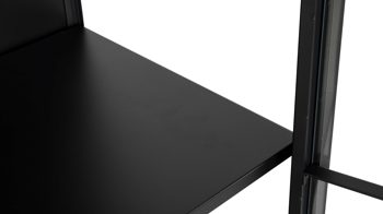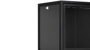 Diese Vitrine ist im modern interpretierten Industriestil designt. Damit verströmt sie spezielles Flair und zieht die Blicke auf sich. Der außergewöhnlich gestaltete Vitrinenschrank besteht aus mattschwarz pulverbeschichtetem Metall mit rauer Oberfläche und dazu gehärtetem Klarglas. Durch die erstklassigen Materialien und die hochwertige Verarbeitung ist er enorm robust und langlebig.