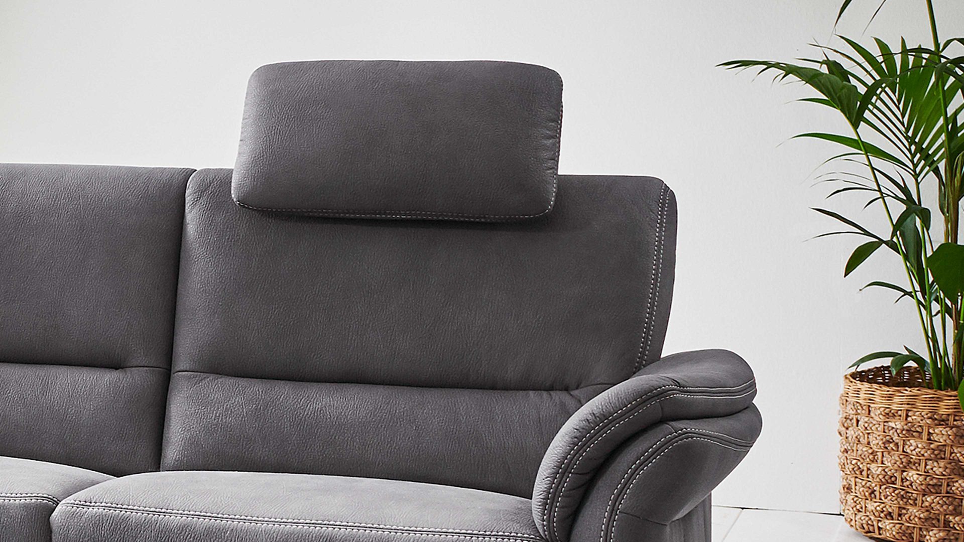 Die Premium-Kopfstütze PKS fungiert als Mehrpreis-Zubehör für die Sofas mit grauem Mikrofaserbezug aus dem Modulmaster Programm MM-ZE1049.