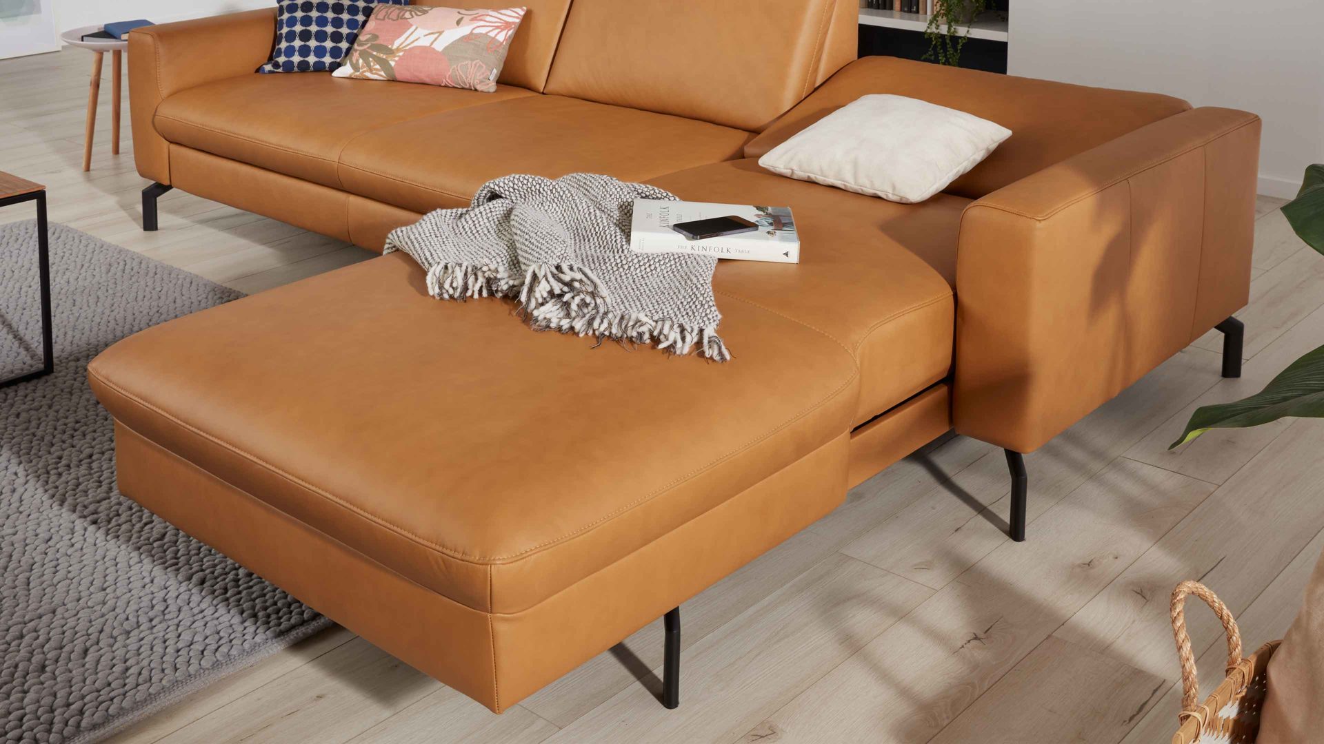 Die lederbezogene Liegefläche ist ein Mehrpreis für die Möbel mit Bettfunktion aus dem Modulmaster-Polsterprogramm MM-PN1126. Durch dieses Extra präsentiert sich die Liegefläche im Originalbezug des jeweiligen Sofas. Das kurkumafarben pigmentierte Glattleder präsentiert sich modern und elegant.