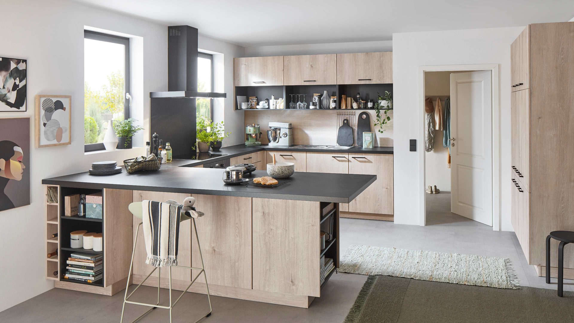 Die nobilia® Einbauküche Natura kombiniert das natürliche, warme Flair von Eiche Montreal-Nachbildung mit Arbeitsplatten, Regalen, Metallgriffen und einer Nischenrückwand in Schwarz.