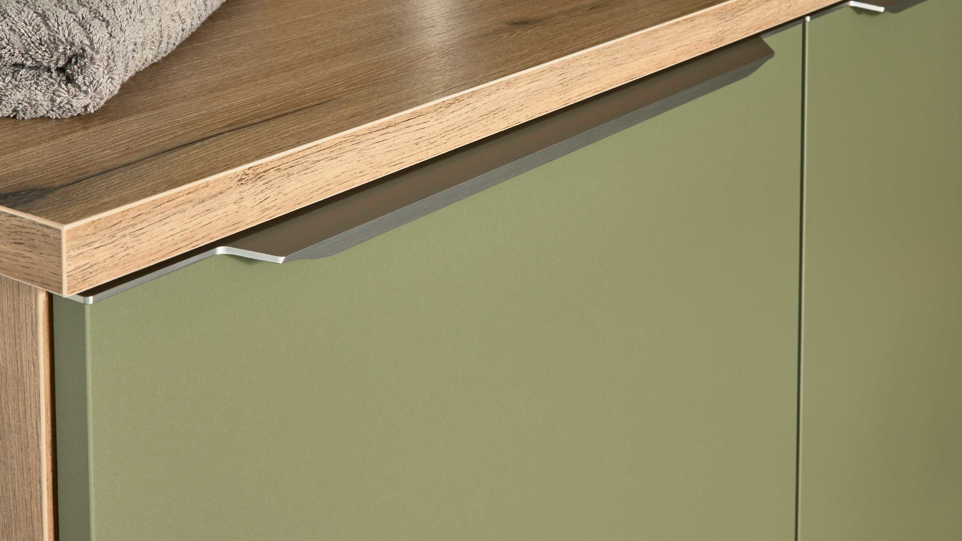 Interliving Küche Serie 3074 – stilvolle Hauswirtschaftsraumlösung in Olivgrün und Vulkaneiche für Ordnung und Wohnlichkeit