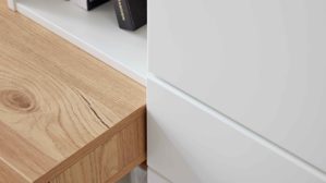 Die Oberflächen der Serie bestehen aus strapazierfähigem Melaminharz, sind kratzfest, UV-beständig und pflegeleicht – optimal für den täglichen Gebrauch im Homeoffice. Die Verbindung von Tonweiß matt und Risseiche-Nachbildung wirkt modern, freundlich und zeitlos – und fügt sich harmonisch in dein bestehendes Wohnkonzept ein.
