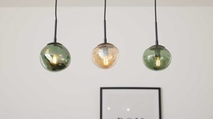 Mit der Hängelampe aus der Interliving Leuchten Serie 9350 bringst du ein echtes Design-Statement in deinen Wohnraum. DRei organisch geformte, matte Glas-Lampenschirme in den Farbtönen Amber, Grün und Rauch sorgen für ein lebendiges Lichtspiel, während der mattschwarze Metallsockel und die schwarzen Textilkabel der Pendelleuchte einen modernen Look verleihen.