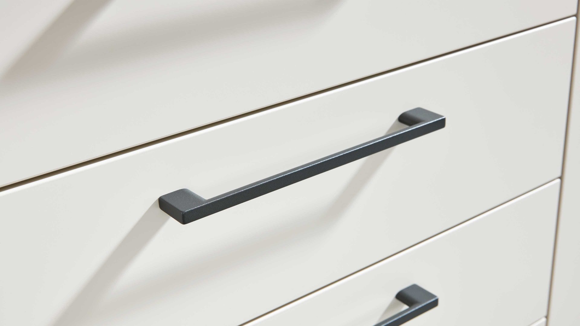 Eine hochwertige, funktionale Kommode, die Ordnung schafft und mit ihrer Kombination aus Holz, Mattlack und Metallgriffen einen modernen Akzent in dein Schlafzimmer bringt.