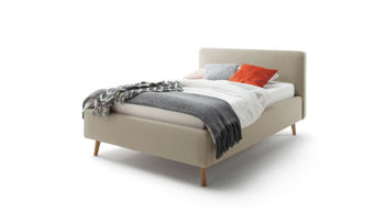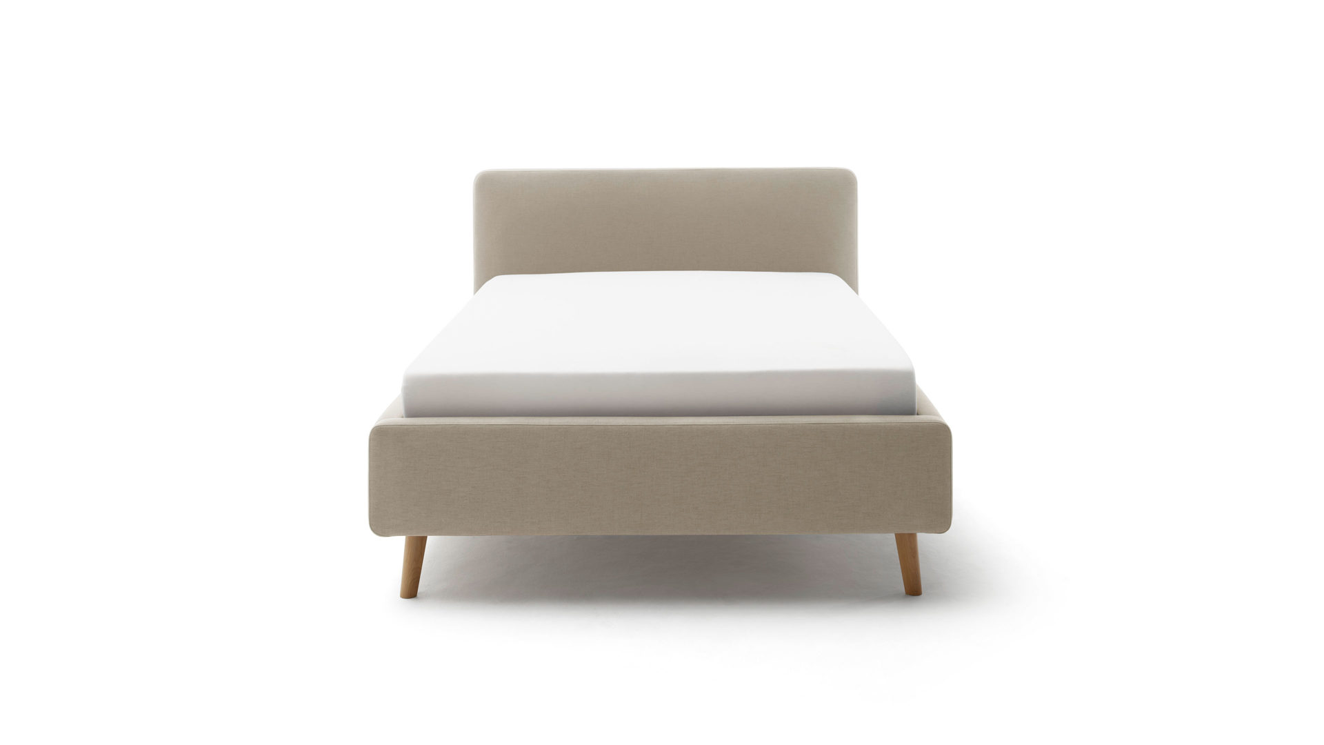 Das Polsterbettgestell Mattis begeistert durch die elegante Optik sowie die hervorragende Material- und Verarbeitungsqualität. Es kombiniert einen taupefarbenen Flachgewebe-Bezug mit eichefarbenen Holzfüßen. Sowohl die Bettseiten als auch das Polsterkopfteil sind glatt bezogen. Letzteres lädt Sie ein, sich anzulehnen, wenn Sie abends im Bett vor dem Schlafen noch fernsehen oder in einem Buch lesen.