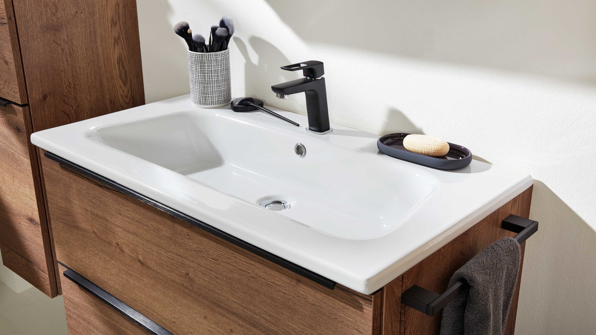 Die Korpusse und Fronten des Unterschranks (Typ 2837) sind in Havanna Eiche-Nachbildung gefertigt, mit umlaufenden eichefarbenen Kanten und mattschwarzen Griffleisten. Im Inneren sorgt die damastweiße Ausführung für eine helle, freundliche Optik. Der Siphon Ausschnitt (Typ 9381) für das Waschbecken ist bereits enthalten. Das weiße Keramik-Waschbecken (Typ 87737) bildet dazu einen modernen Kontrast und setzt klare Akzente.