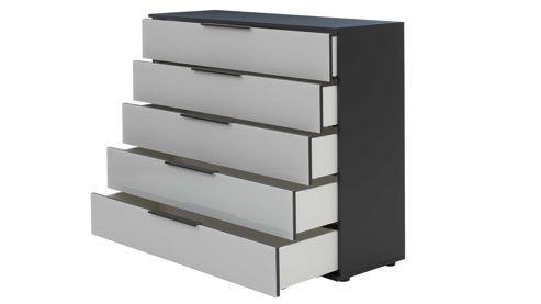Mit Maßen von ca. 120 x 102 x 46 cm (B/LxHxT) bietet die Kommode großzügigen Platz für Kleidung, Textilien und persönliche Dinge. Fünf Schubladen mit Softeinzug und Vollauszug sorgen für leisen Bedienkomfort und eine übersichtliche Organisation. Der weiß lackierte Innenkorpus setzt einen hellen, gepflegten Akzent, während die Softabstoppung der Schubladen die hochwertige Verarbeitung unterstreicht.