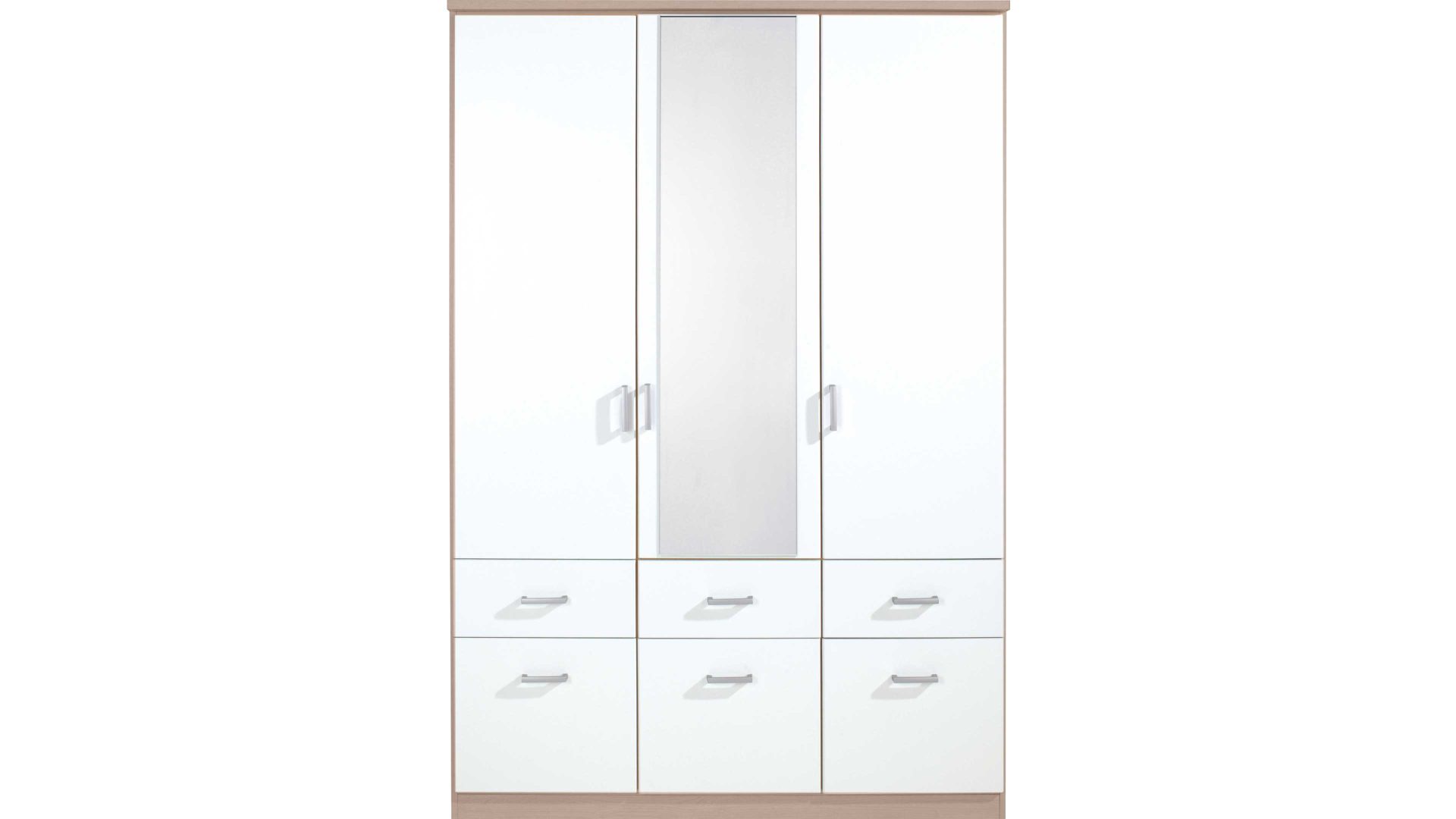 Die mittlere Tür ist mit einem Spiegel versehen, sodass Sie nach dem Ankleiden Ihr Outfit direkt problemlos kontrollieren. Obendrein wirkt Ihr Raum durch den Spiegel auch etwas größer. Der Korpus ist in einer Nachbildung in Sonoma Eiche gehalten und die Front besticht mit alpinweißen Kunststoffoberflächen. Dank dieser modernen Optik passt der Schrank hervorragend zu vielen Einrichtungsstilen. Unser Tipp: Gestalten Sie Ihr Schlafzimmer einheitlich für ein Ambiente zum Wohlfühlen mit weiteren Möbeln des Schranksystems Bremen - hier mit nur einem Klick zum ganzen Programm. Weitere Schränke erhalten Sie mit der Produktnummer 698201.