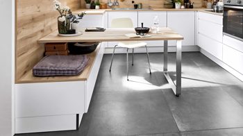 Zu den Highlights der nolte Einbauküche Sigma gehören der Ansetztisch mit Edelstahl-Kufengestell für den schnellen Snack zwischendurch und gemeinsames Kochen sowie die als Sitzbank nutzbaren Unterschränke.