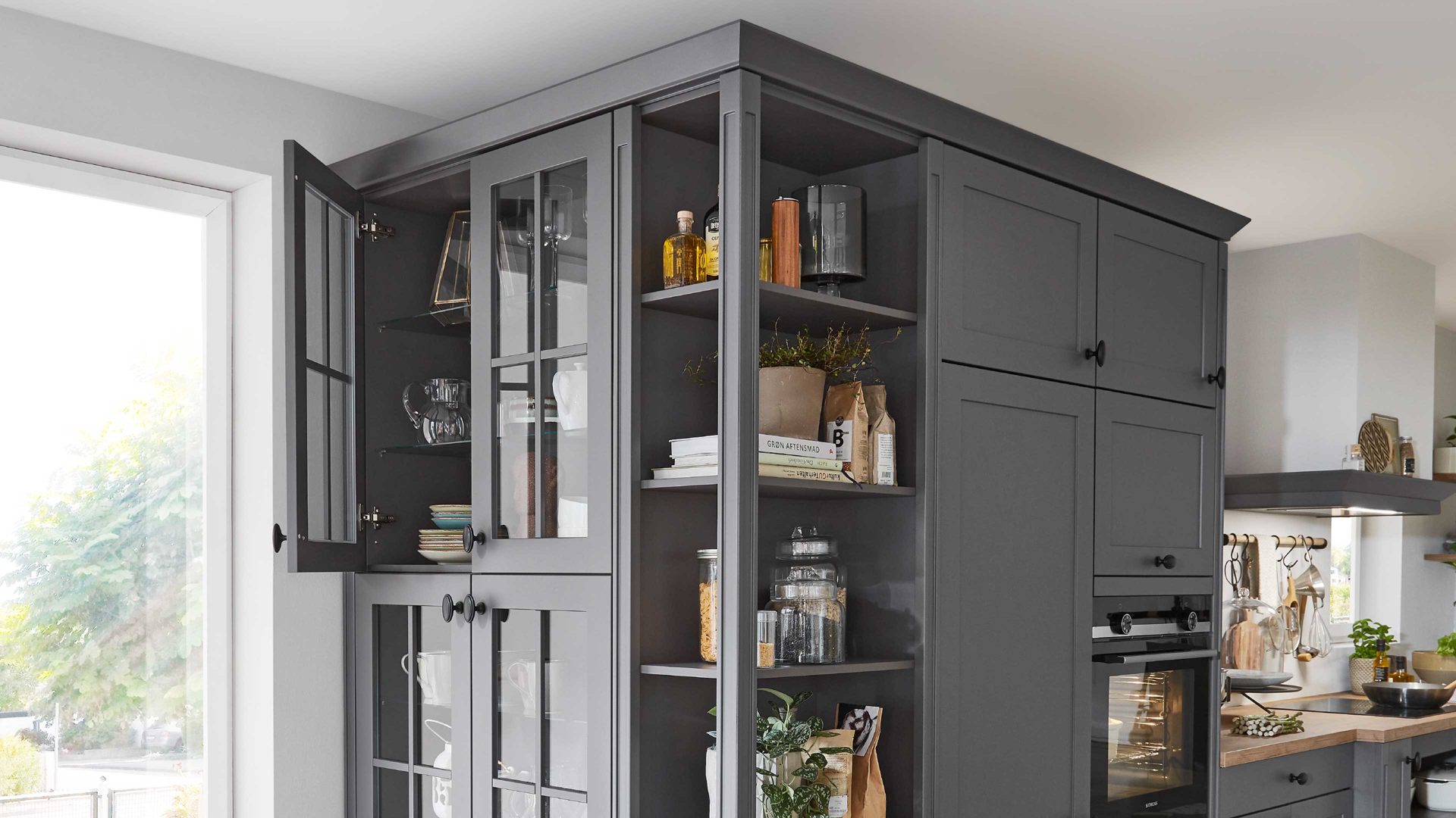 die geräumige Eckvitrine mit offenem Regal und Glasschränken, die vorgezogene Kochstelle sowie die Landhaus-Kaminhaube.