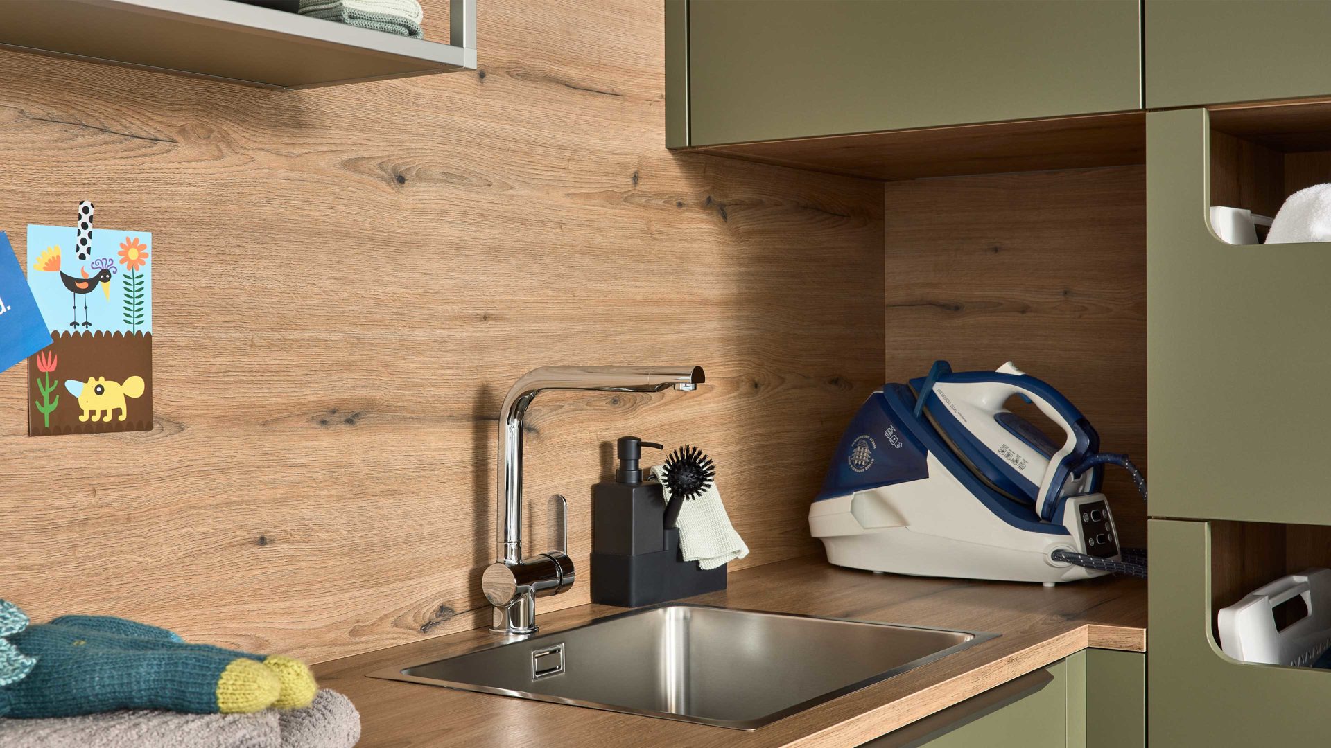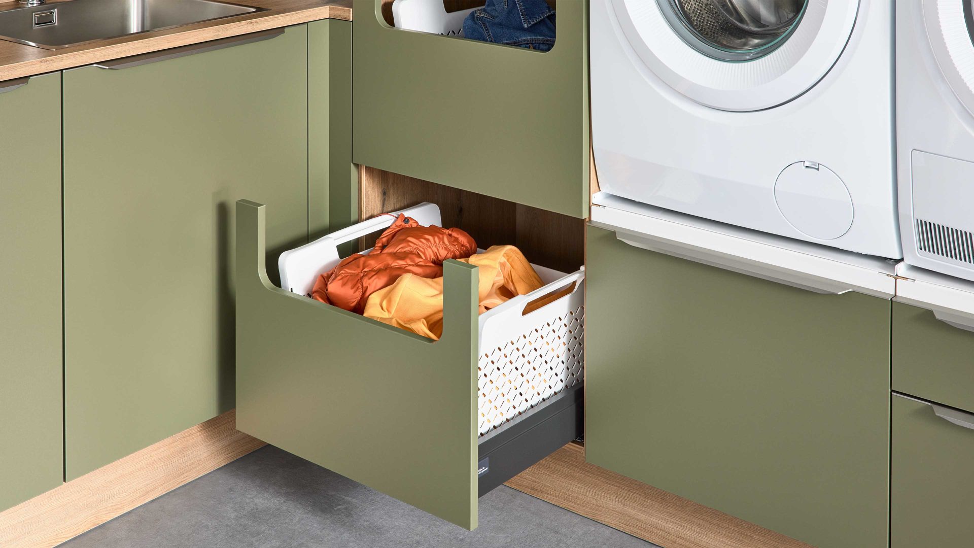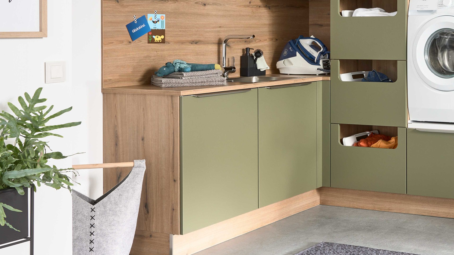 Interliving Küche Serie 3074 – stilvolle Hauswirtschaftsraumlösung in Olivgrün und Vulkaneiche für Ordnung und Wohnlichkeit