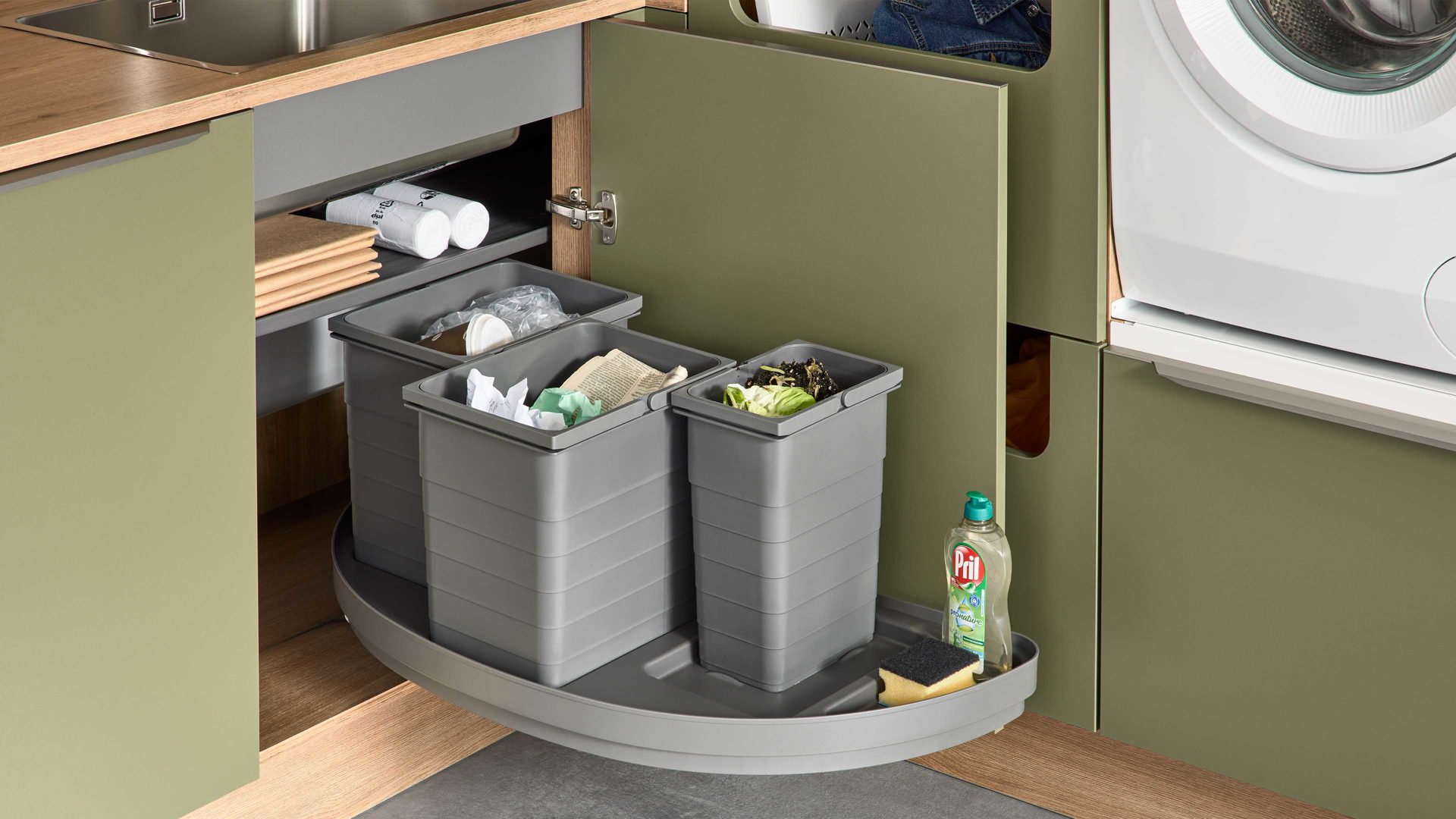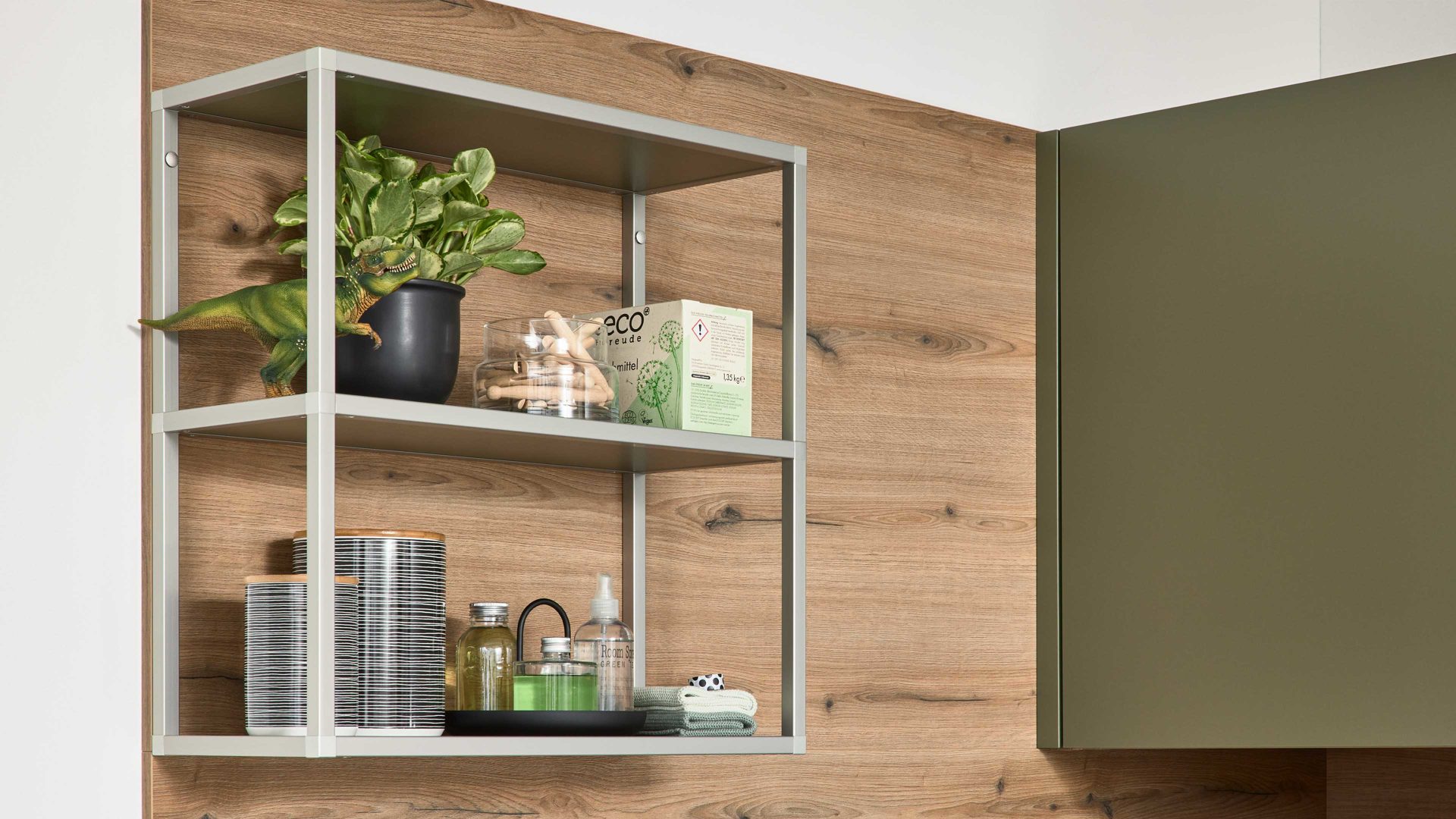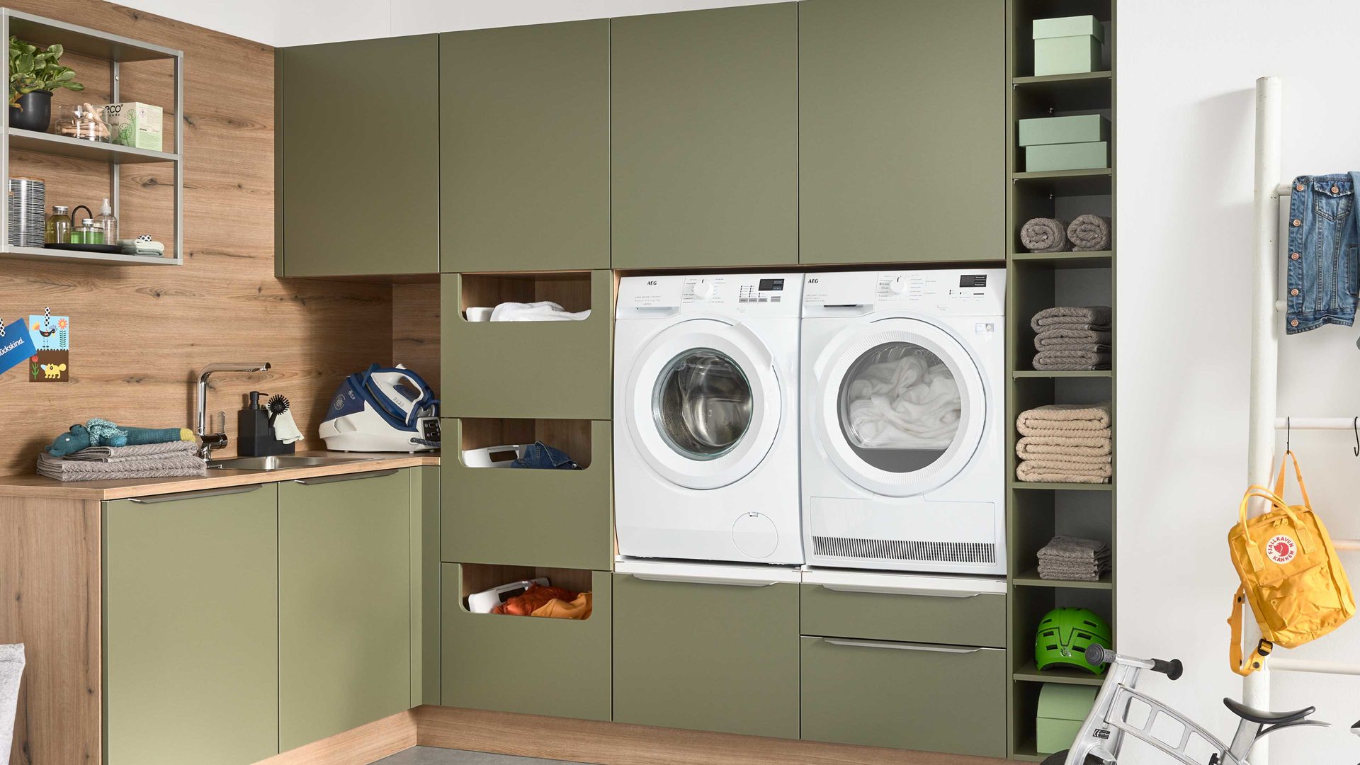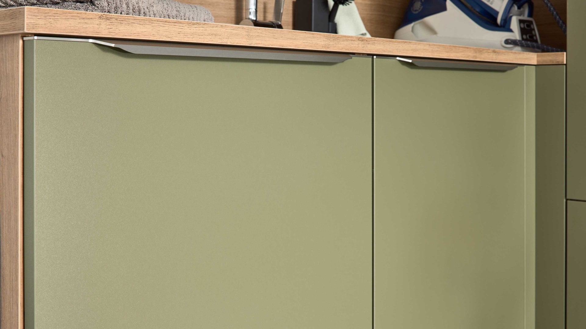 Interliving Küche Serie 3074 – stilvolle Hauswirtschaftsraumlösung in Olivgrün und Vulkaneiche für Ordnung und Wohnlichkeit