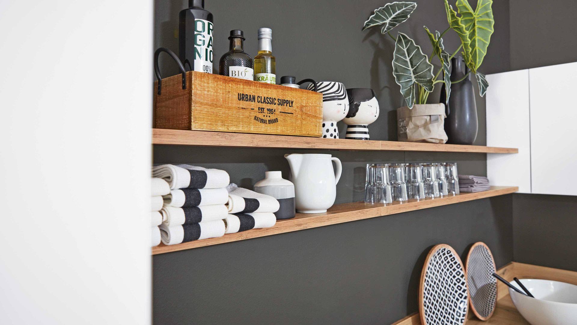 Die Interliving Küche Serie 3043 verbindet elegante Schlichtheit mit natürlichem Charme. Ihre softmatten weißen Fronten harmonieren perfekt mit der warmen Vulkaneiche-Nachbildung, die sich in Arbeitsplatten, Nischenrückwänden, Griffen und Regalen wiederfindet. Korpusse und Sockelblenden in klassischem Weiß setzen helle Akzente, während die grifflosen Oberschränke das puristische Design abrunden.