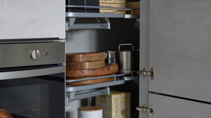 Die Interliving Küche Serie 3080 bietet modernes Küchendesign mit klaren Linien und funktionalen Details. Die Fronten in weißer Beton Nachbildung werden durch mattes Platingrau und mattschwarze Griffleisten stilvoll ergänzt. Das Ergebnis ist ein edler Materialmix mit urbanem Charakter – perfekt für eine moderne Küchenarchitektur.