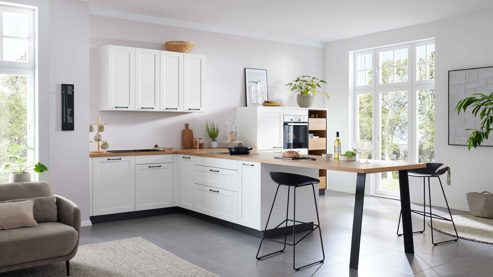 WERT KÜCHE® Vida - Moderne Landhausküche in Satinweiß mit natürlicher Asteiche