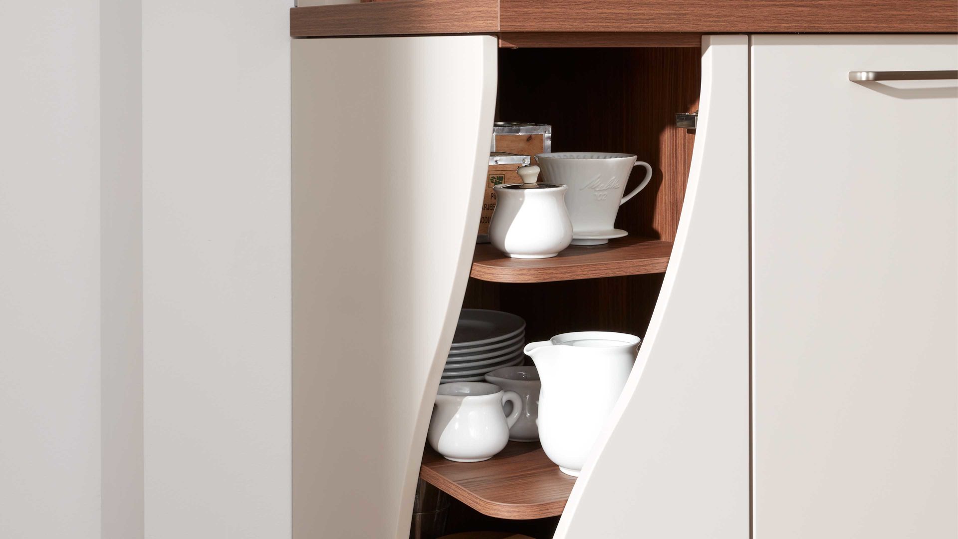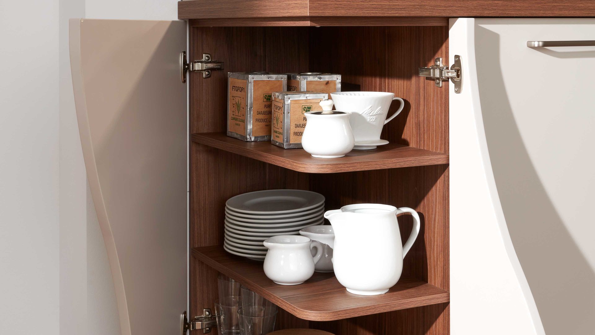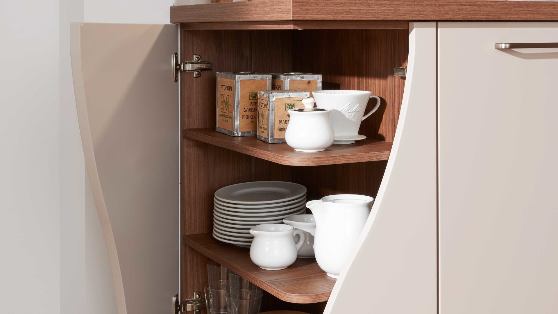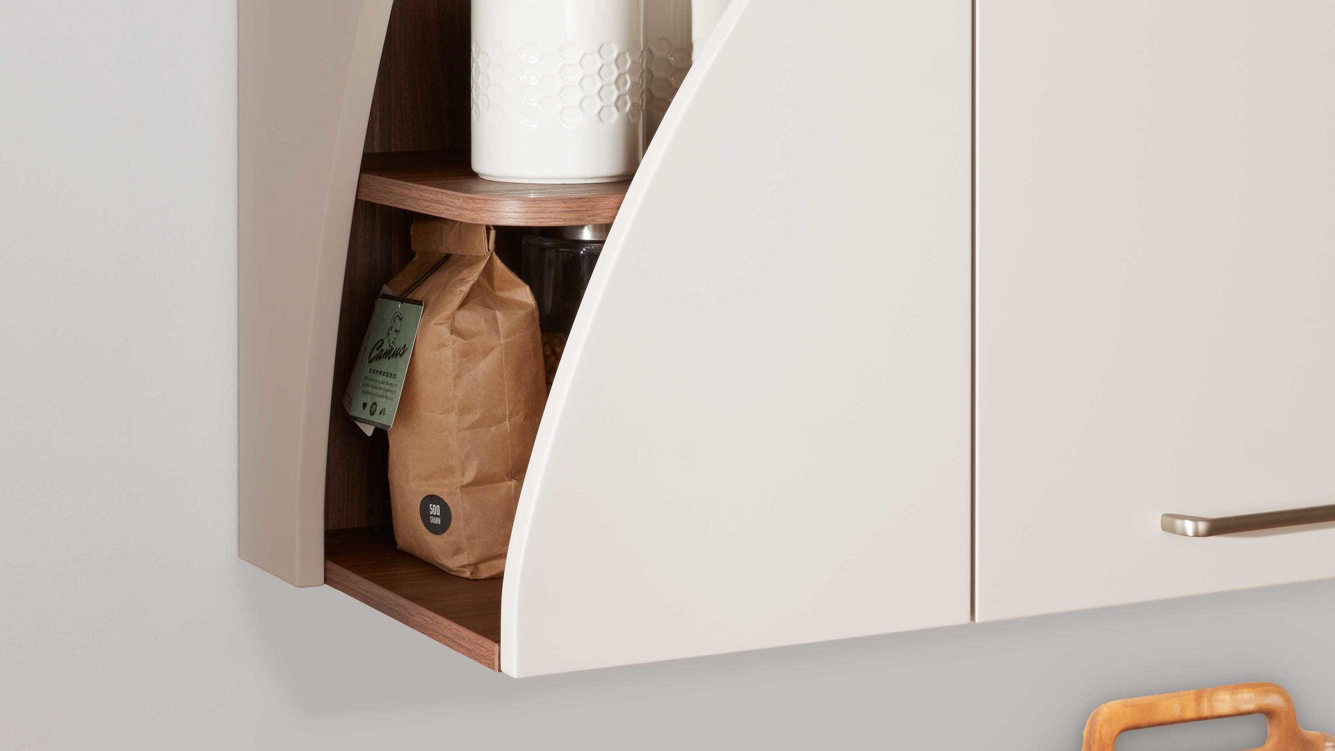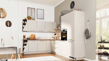 Die Interliving Küche Serie 3005 verbindet zeitlose Eleganz mit praktischer Funktionalität. Ihre hochwertigen saharafarbenen Softlack-Fronten bringen eine warme, einladende Ausstrahlung in den Raum. Im Zusammenspiel mit den nussbaumfarbenen Arbeitsplatten entsteht ein edles Farbkonzept, das sofort ins Auge fällt. Besonders raffiniert wirken die halboffenen Schrankelemente mit geschwungenen Türen am linken Rand – sie setzen ein unverwechselbares Highlight und verleihen der Küche einen individuellen Charakter.