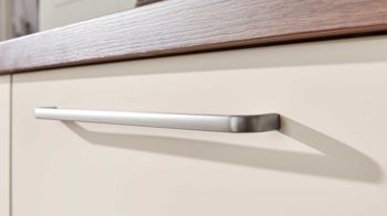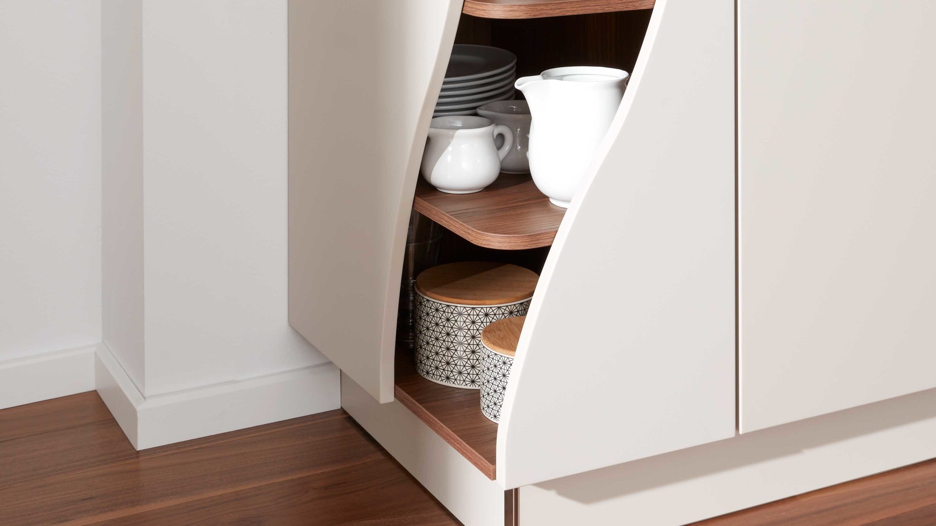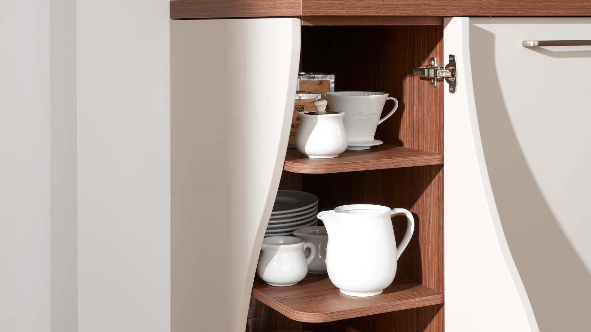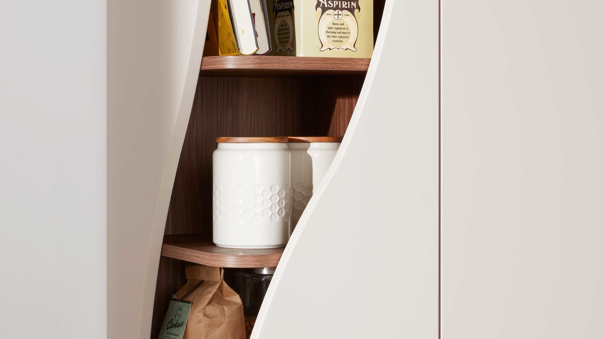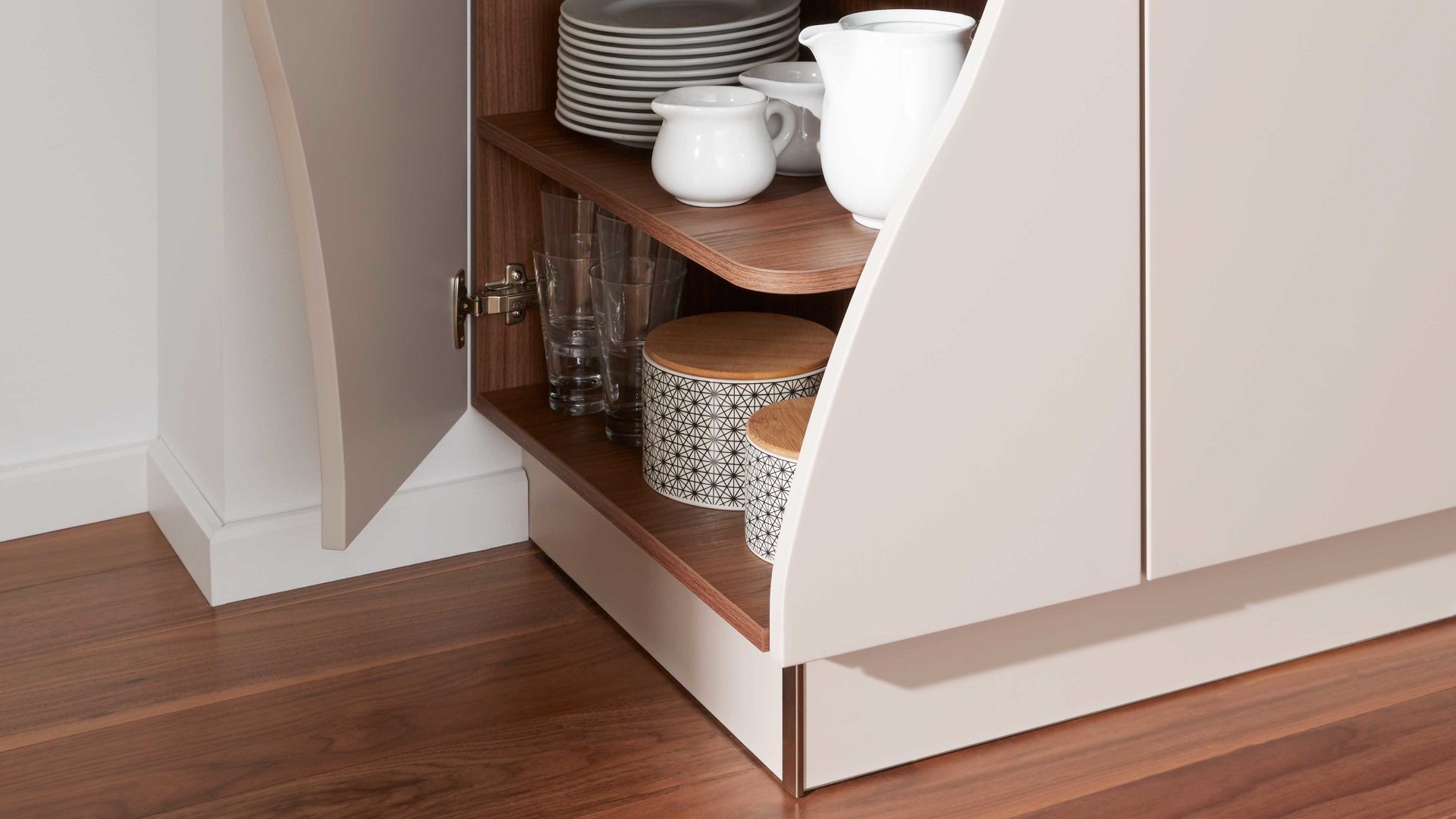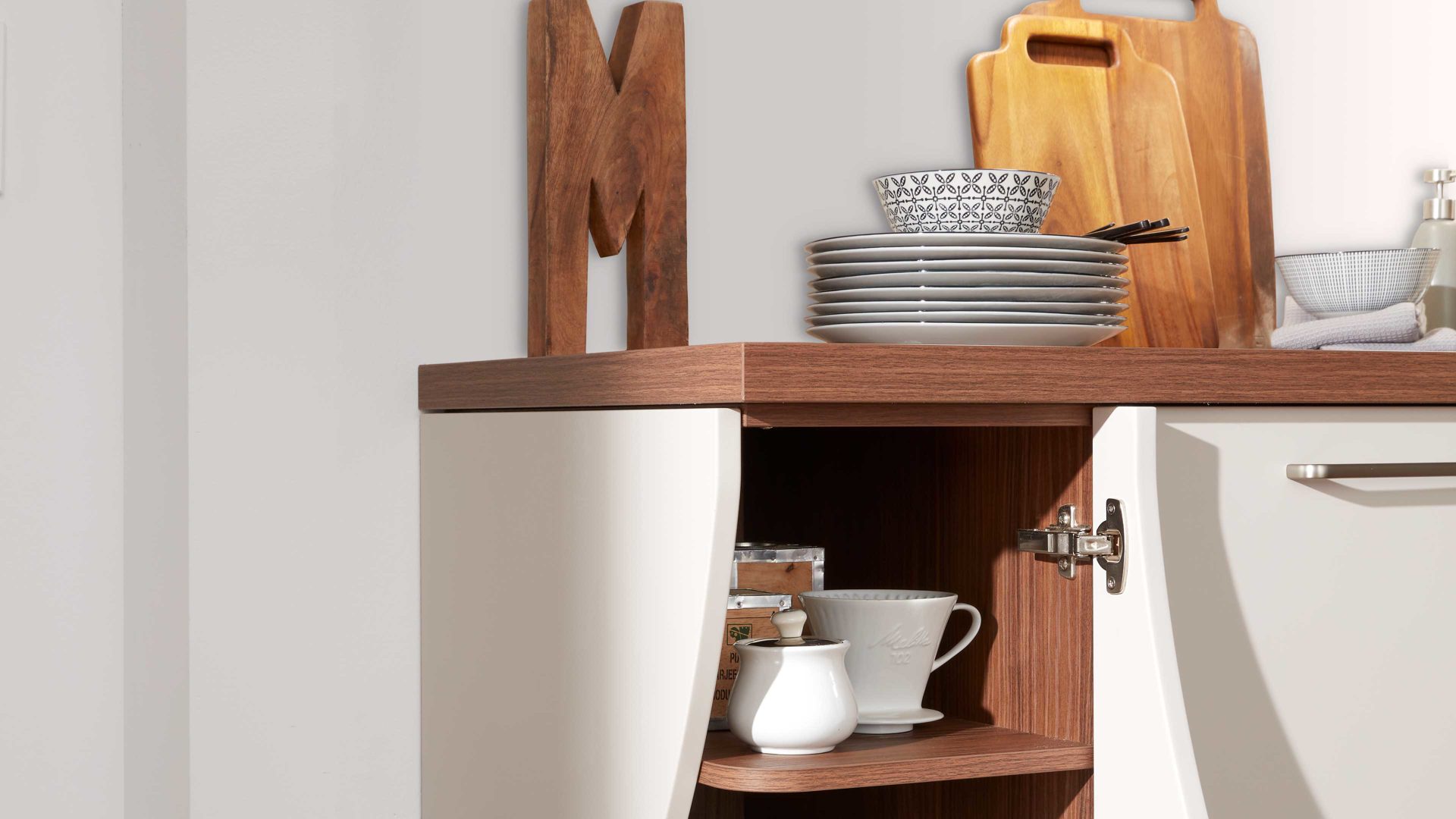Die Interliving Küche Serie 3005 verbindet zeitlose Eleganz mit praktischer Funktionalität. Ihre hochwertigen saharafarbenen Softlack-Fronten bringen eine warme, einladende Ausstrahlung in den Raum. Im Zusammenspiel mit den nussbaumfarbenen Arbeitsplatten entsteht ein edles Farbkonzept, das sofort ins Auge fällt. Besonders raffiniert wirken die halboffenen Schrankelemente mit geschwungenen Türen am linken Rand – sie setzen ein unverwechselbares Highlight und verleihen der Küche einen individuellen Charakter.