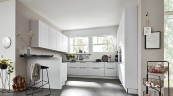 Die Interliving Küche Serie 3045 verbindet klassische Schlichtheit mit modernen Details. Ihre softmatten weißen Fronten wirken zeitlos elegant und harmonieren perfekt mit den premiumweißen Korpussen und Sockelblenden. Für spannende Kontraste sorgen die Arbeitsplatten im Farbton Terra Mare sowie die schwarzen Griffe und der schwarze Tresen, die dem Design eine stilvolle Landhausnote verleihen.