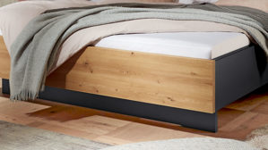 Doppelbettgestell mit Rauchglasböden im überstehenden Holz-Kopfteil