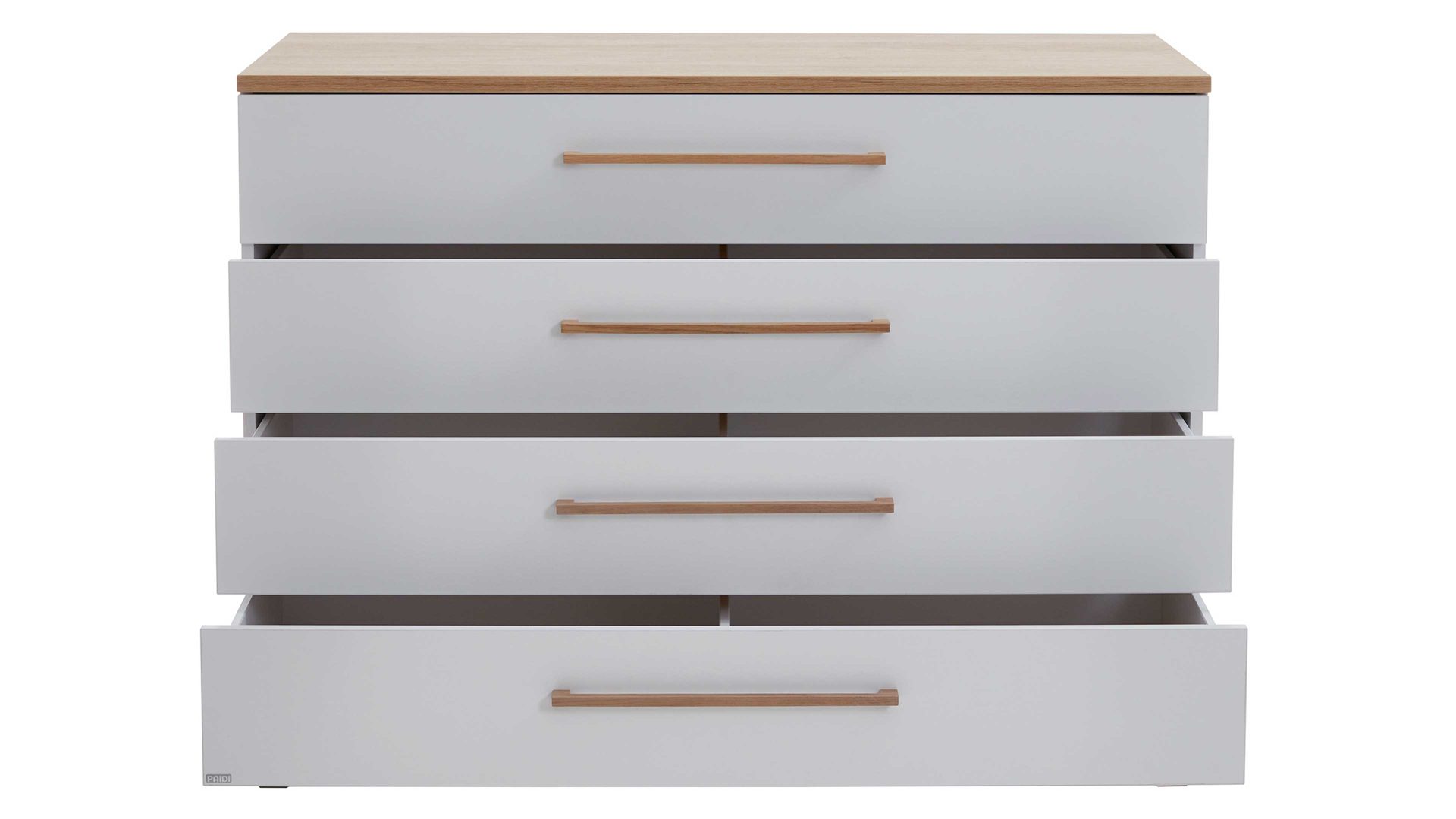 Funktional überzeugt die erstklassig verarbeitete Kommode mit vier Schubladen, von denen die oberste mit Vollauszug ausgestattet ist. Somit steht reichlich Stauraum für Unterwäsche, Bettwäsche, Handtücher und sonstige Textilien oder auch empfindliche Accessoires zur Verfügung, die licht- und staubgeschützt aufbewahrt werden sollen. Der Oberboden des Kommodenschranks bietet Platz für dekorative Elemente, etwa eine Vase oder einen Bilderrahmen mit persönlichem Foto. Gegen Mehrpreis ist der Schrank mit einem Schubladeneinsatz und einem Wickelaufsatz ergänzbar. Auf ca. 124 x 95 x 56 cm (BxHxT) belaufen sich die Maße der praktischen Schubladenkommode.