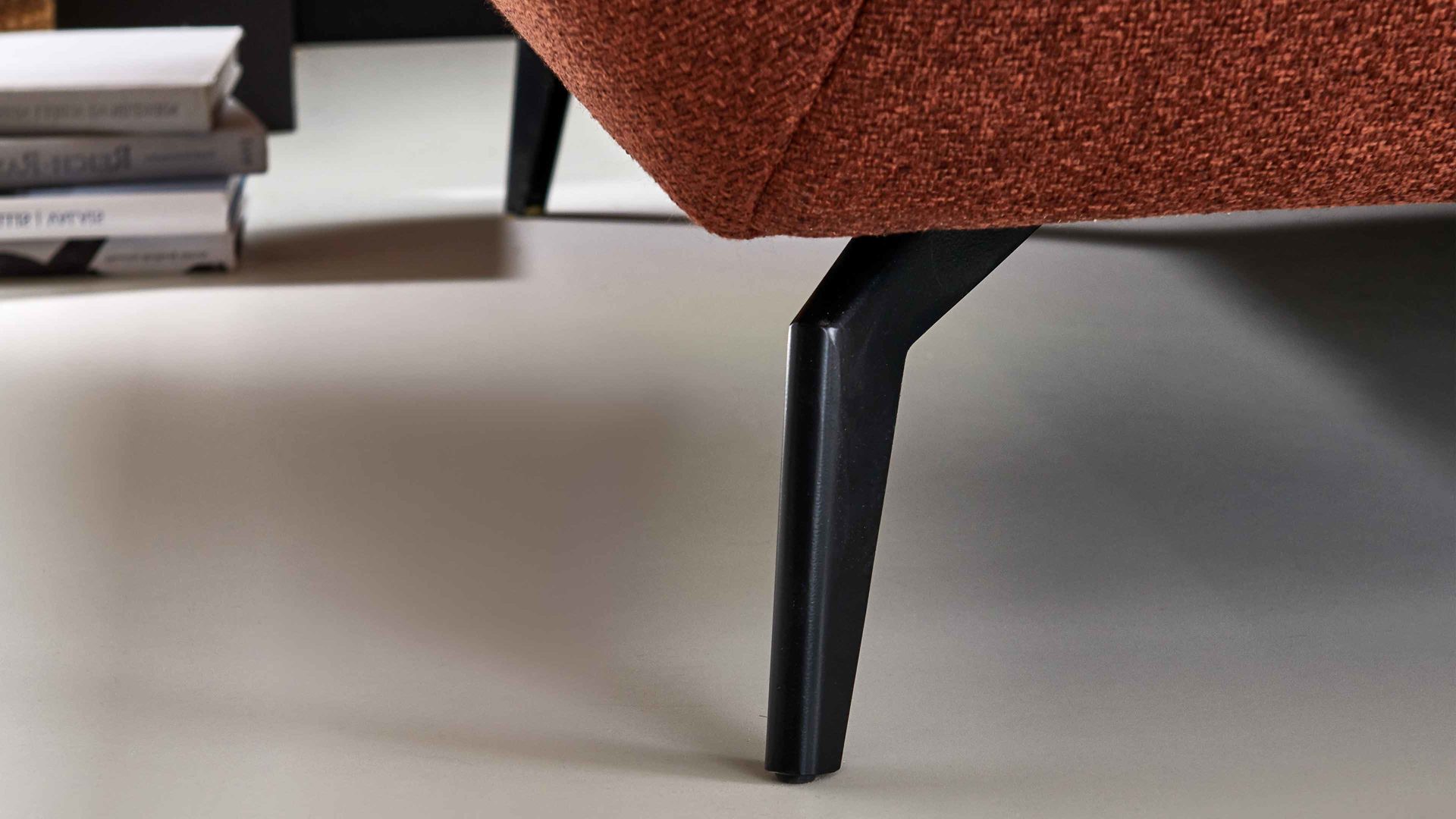 Der trendige und spezielle kupferfarbene Stoffbezug sorgt für ein edles Design. Mattschwarze Metallfüße runden die Optik stimmig ab und tragen überdies zur Stabilität des attraktiven Sofas bei. Einen gelungenen Akzent setzt die gesteppte Sitzfläche. Der Rücken der Couch ist glatt bezogen.