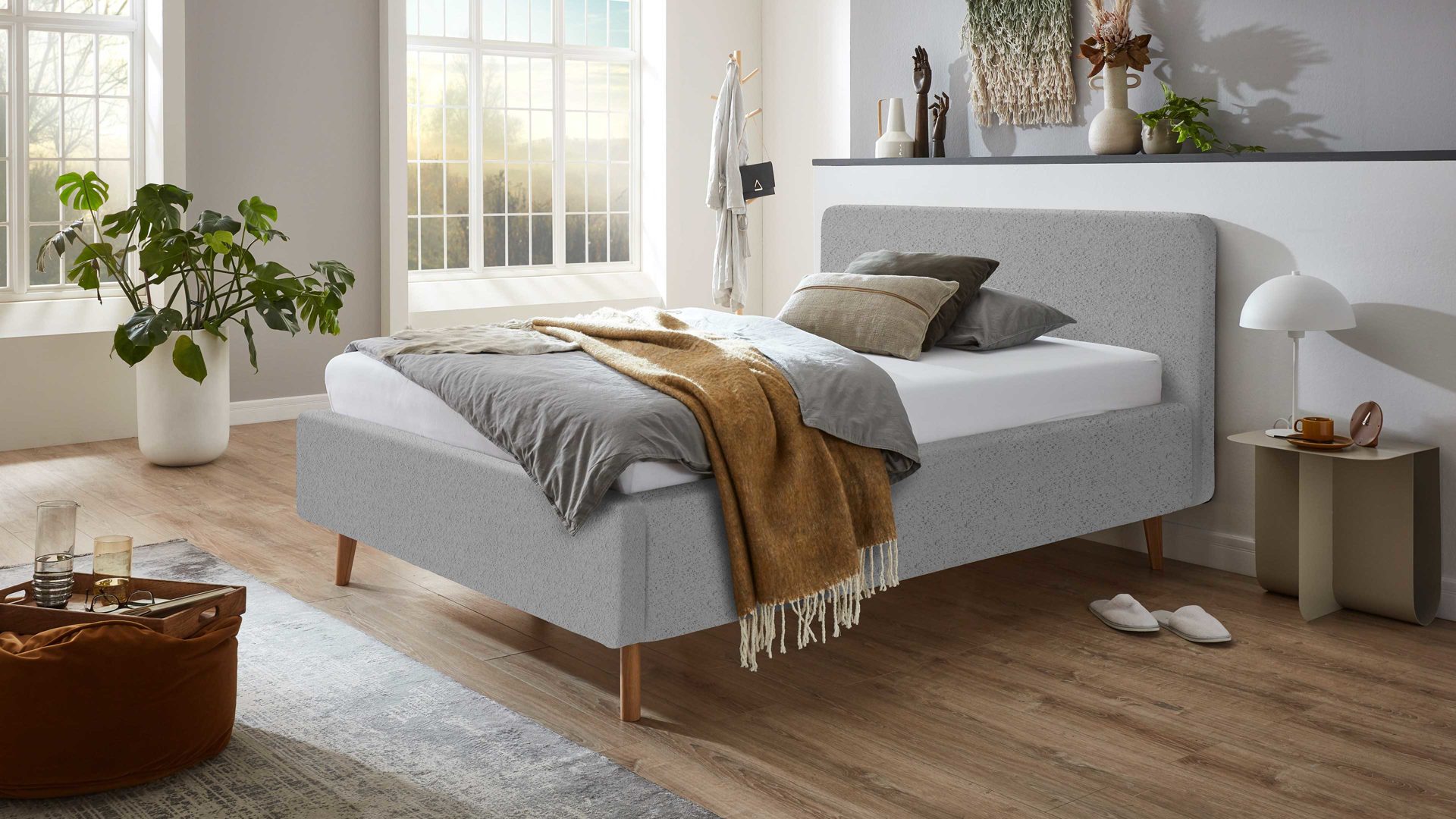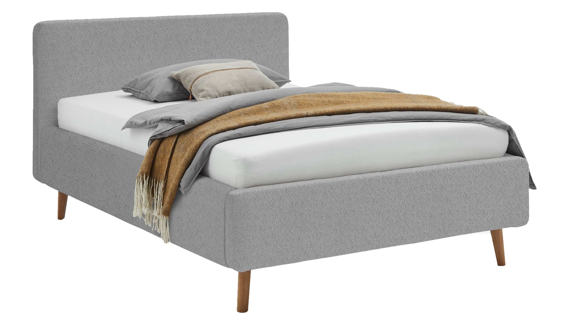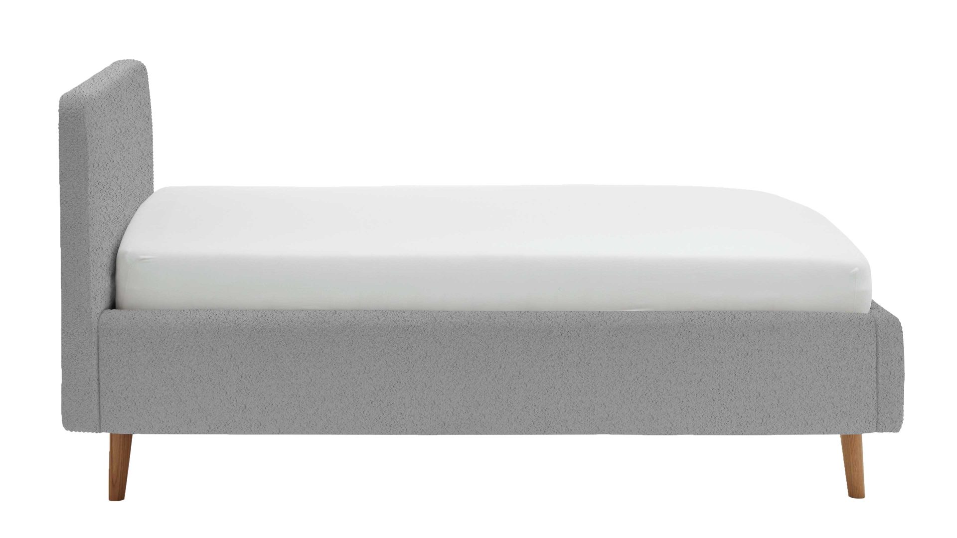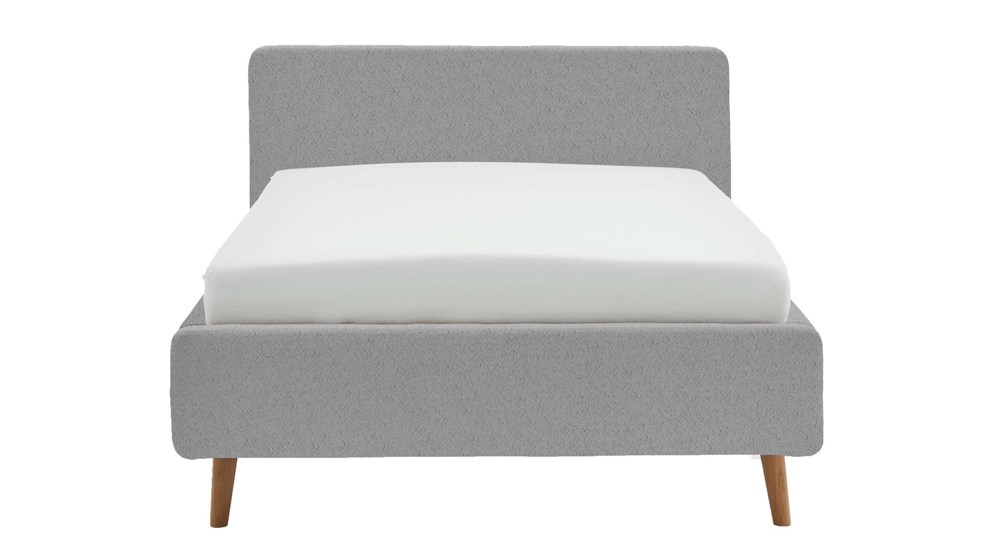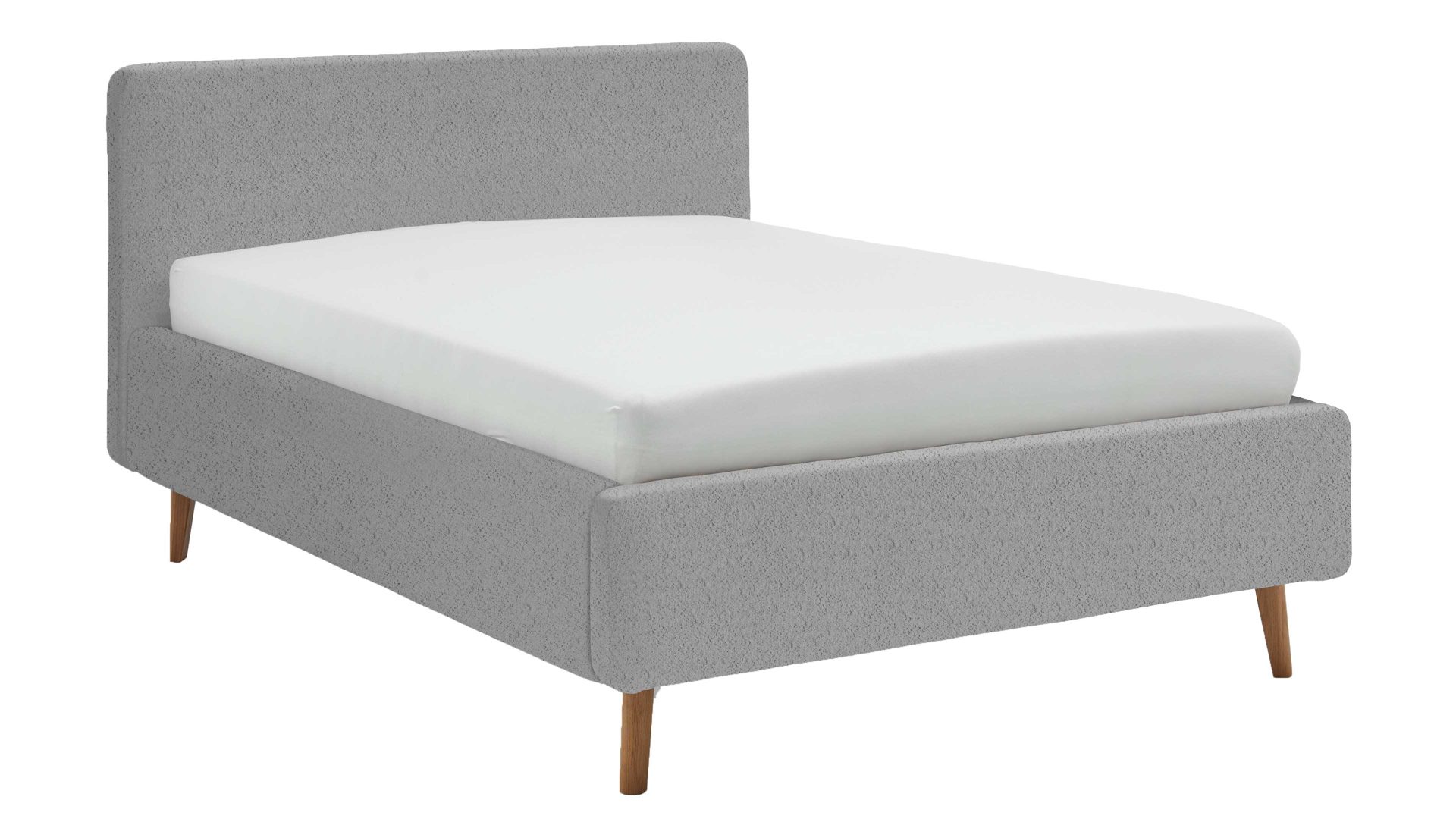 Das Polsterbettgestell Mattis begeistert durch die elegante Optik sowie die hervorragende Material- und Verarbeitungsqualität. Es kombiniert einen grauen Boulcle-Bezug mit eichefarbenen Holzfüßen. Sowohl die Bettseiten als auch das Polsterkopfteil sind glatt bezogen. Letzteres lädt Sie ein, sich anzulehnen, wenn Sie abends im Bett vor dem Schlafen noch fernsehen oder in einem Buch lesen.