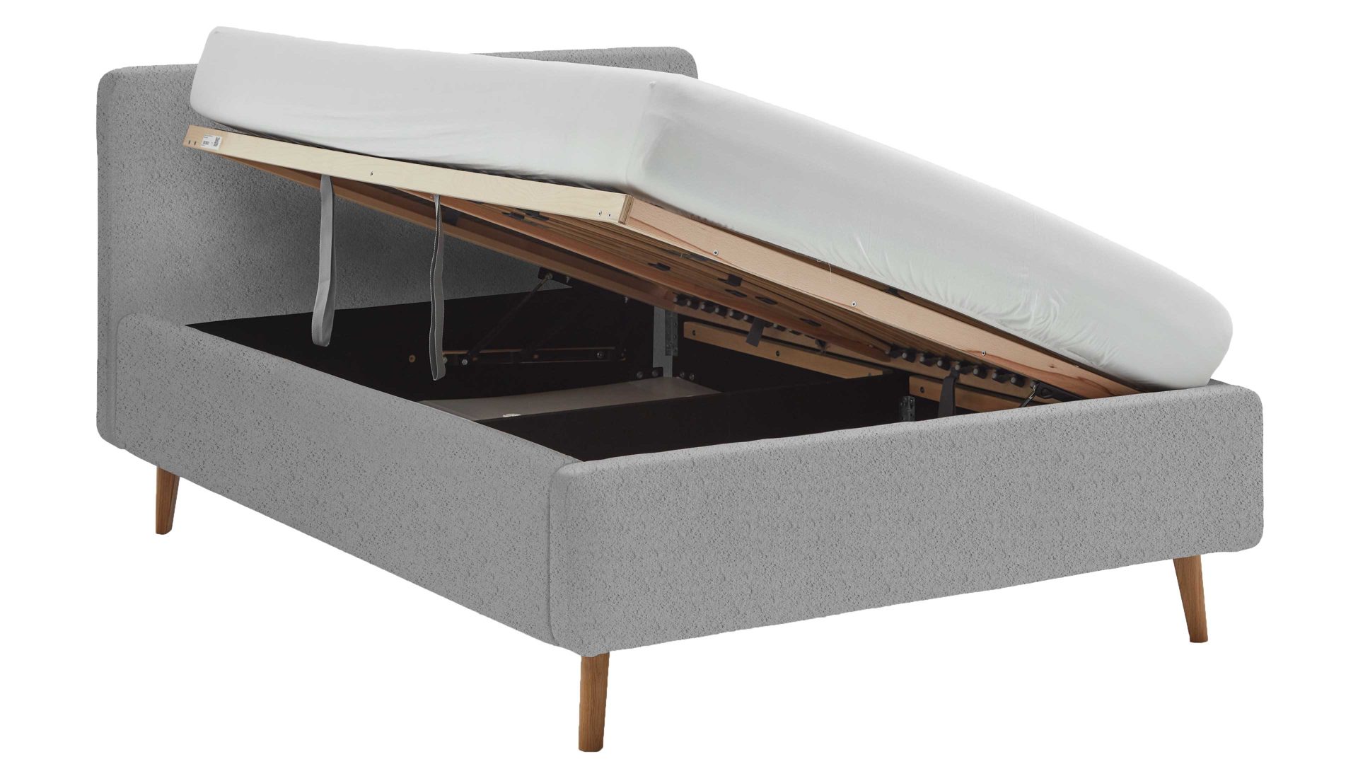 Im Lieferumfang des Bettgestells ist ein hochwertiger Lattenrahmen enthalten, der 28 Federholzleisten mit Härtegradverstellung aufweist. Klappen Sie den Lattenrahmen seitlich hoch, um sich Zugang zum Bettkasten mit Gasdruckdämpfer zu verschaffen. In dem geräumigen Kasten können Sie etwa Bettzubehör wie Kissen und Decken sowie viele sonstige Utensilien praktisch platzsparend aufbewahren.
