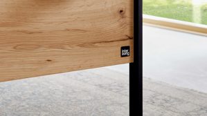 Mit champagnerfarbenen Glasfronten, warmem Kernholzfurnier, Bianco Eiche Nachbildung und stilvollen schwarzen Metallgriffen und -füßen entsteht ein edler Look, der zeitlos wirkt.