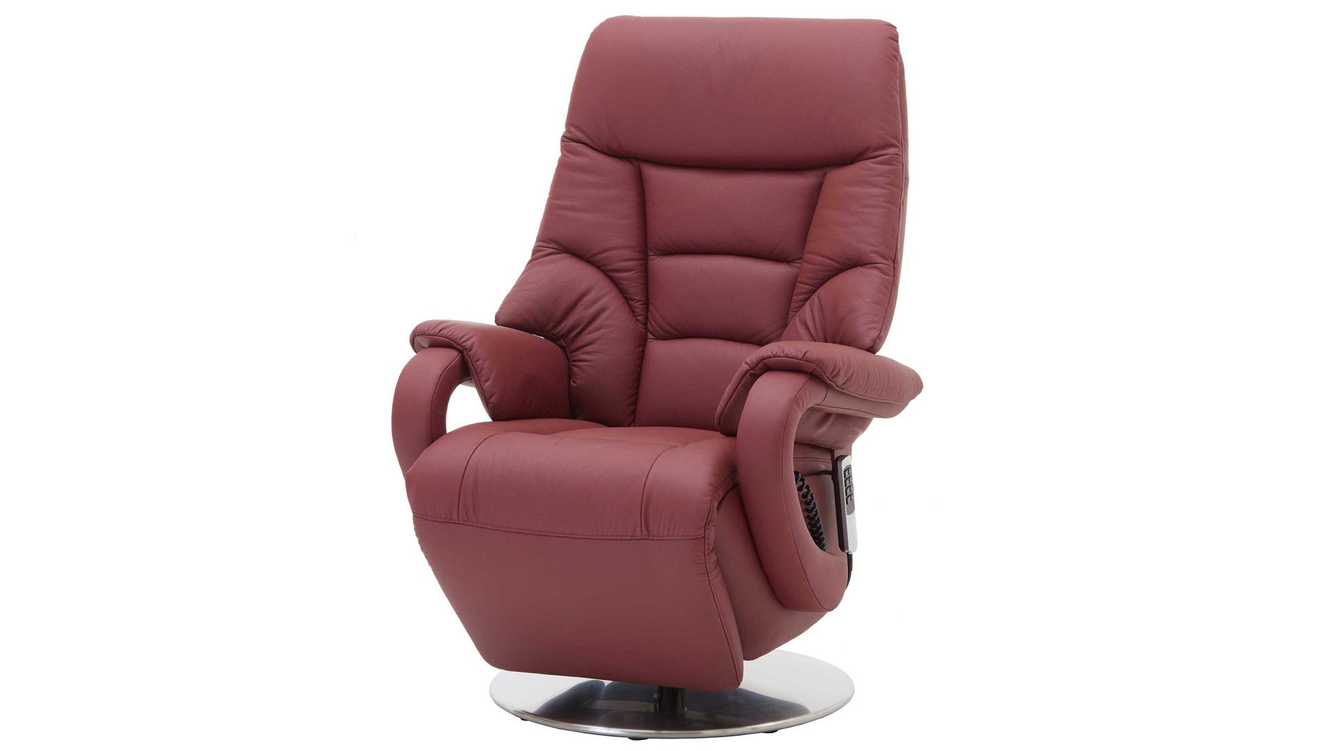 Dieser Relaxsessel kombiniert einen robusten glänzenden Edelstahl-Tellerfuß mit einem stilvollen merlotfarbenen Lederbezug. Durch die optimal aufeinander abgestimmten Materialien und Farben strahlt der Fernsehsessel moderne Eleganz aus. Für die nötige Stabilität sorgt der Stahlrohrrahmen. Er macht den TV-Sessel bis 130 kg belastbar. Die Maße des hochwertig verarbeiteten Relaxsessels belaufen sich auf ca. 80 x 116 x 80 cm (BxHxT), bei einer Sitzhöhe von ca. 49 cm und einer Sitztiefe von ca. 55 cm.
