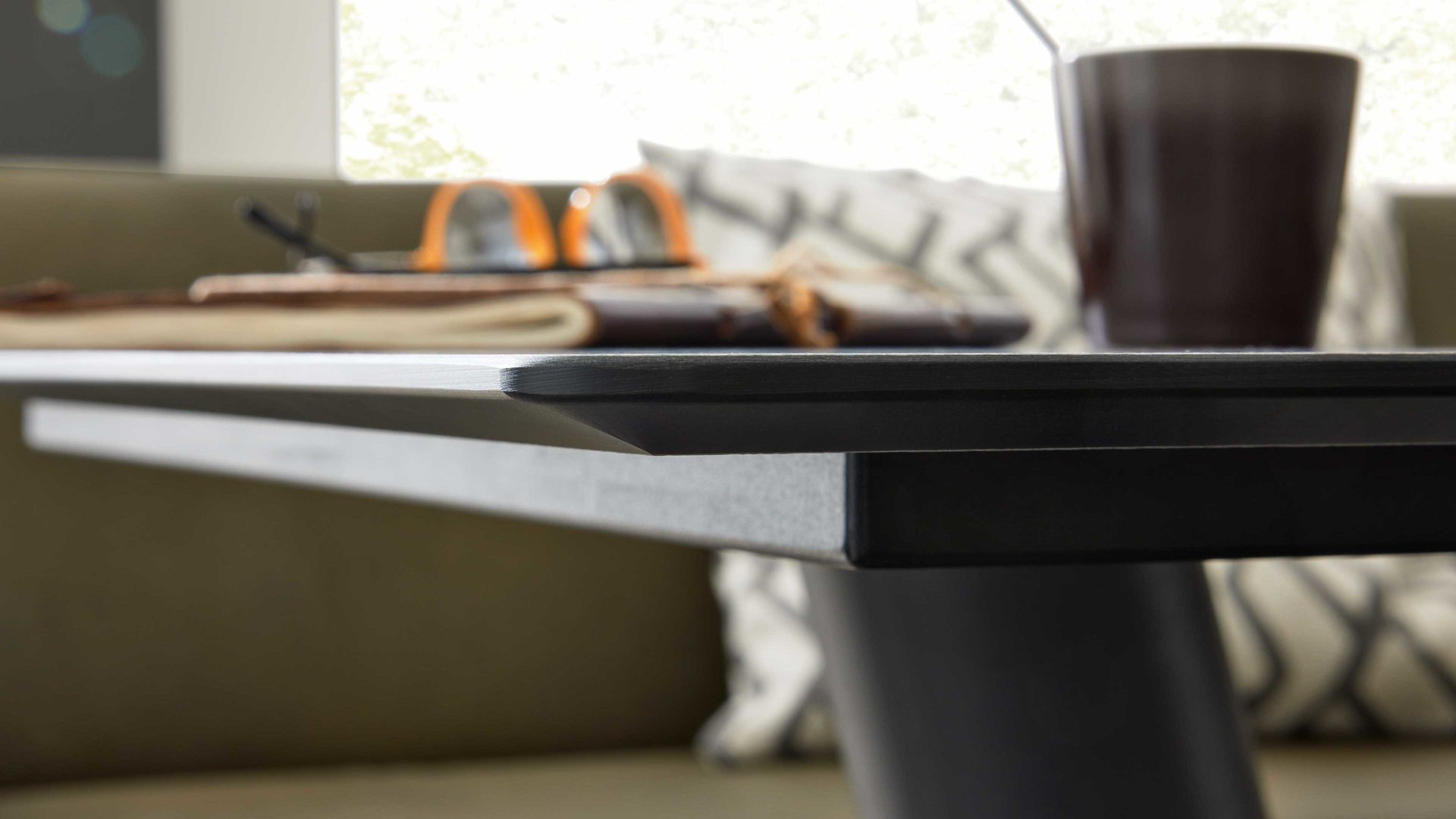 Die Tischplatte besteht aus HPL (High Pressure Laminate) – einem Hochdrucklaminat mit Melaminharz-Oberfläche, das für seine besondere Widerstandsfähigkeit bekannt ist. Mit einer Plattenstärke von ca. 13 mm wirkt sie elegant schlank und modern, während die Facettenkante für ein feines, hochwertiges Finish sorgt. HPL ist ein äußerst strapazierfähiges Material, das im Alltag überzeugt. Es ist kratz- und stoßfest, lichtecht, säurebeständig und wetterfest – perfekt, wenn du einen Esstisch suchst, der nicht nur gut aussieht, sondern auch einiges aushält.