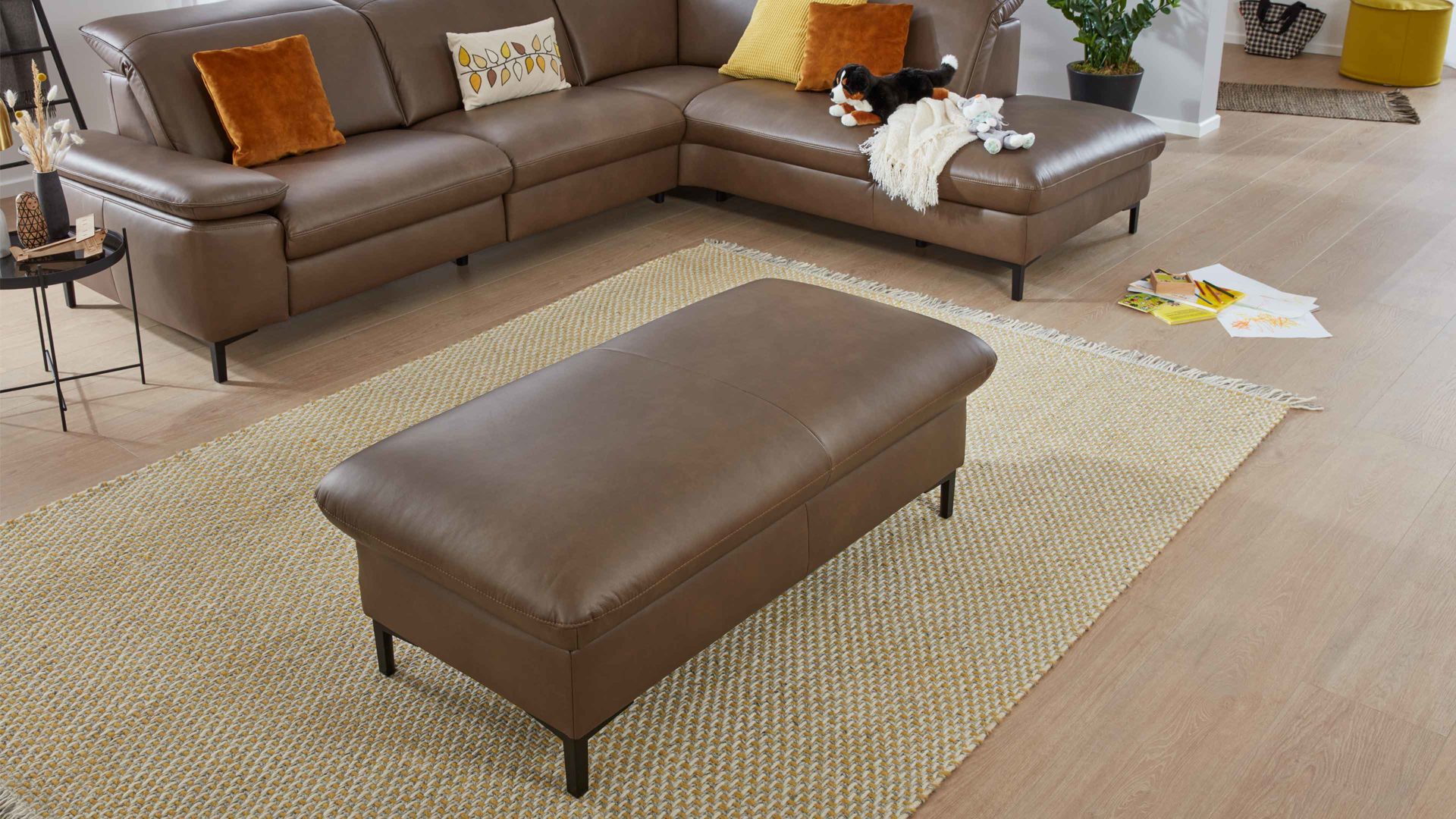 Der XXL-Hocker aus dem Modulmaster-Polsterprogramm MM-PN1137 kombiniert steinfarben pigmentiertes Glattleder mit mattschwarzen Metall-Profilfüßen. Er präsentiert sich modern und elegant.