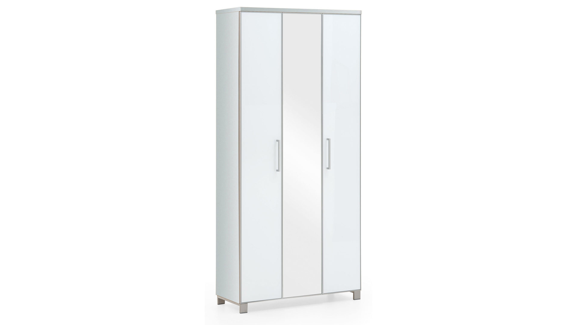 Der Garderobenschrank hat einen weiß lackierten Korpus und optiweiße Glasfronten mit einer Spiegelauflage. Hinter der linken Holztür verstecken sich sieben Schuhgitter, die Stiefel, High Heels und Turnschuhe geschmackvoll aufbewahren, auf der anderen Seite erwartet Sie ein großes Fach, in dem Sie Jacken und Mäntel aufbewahren können.
