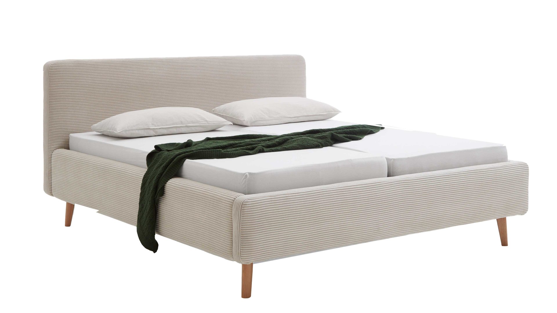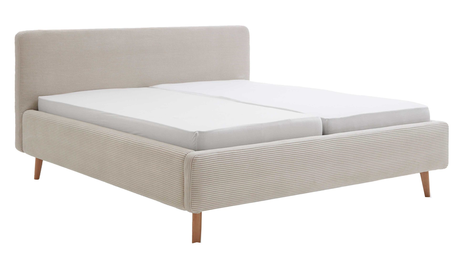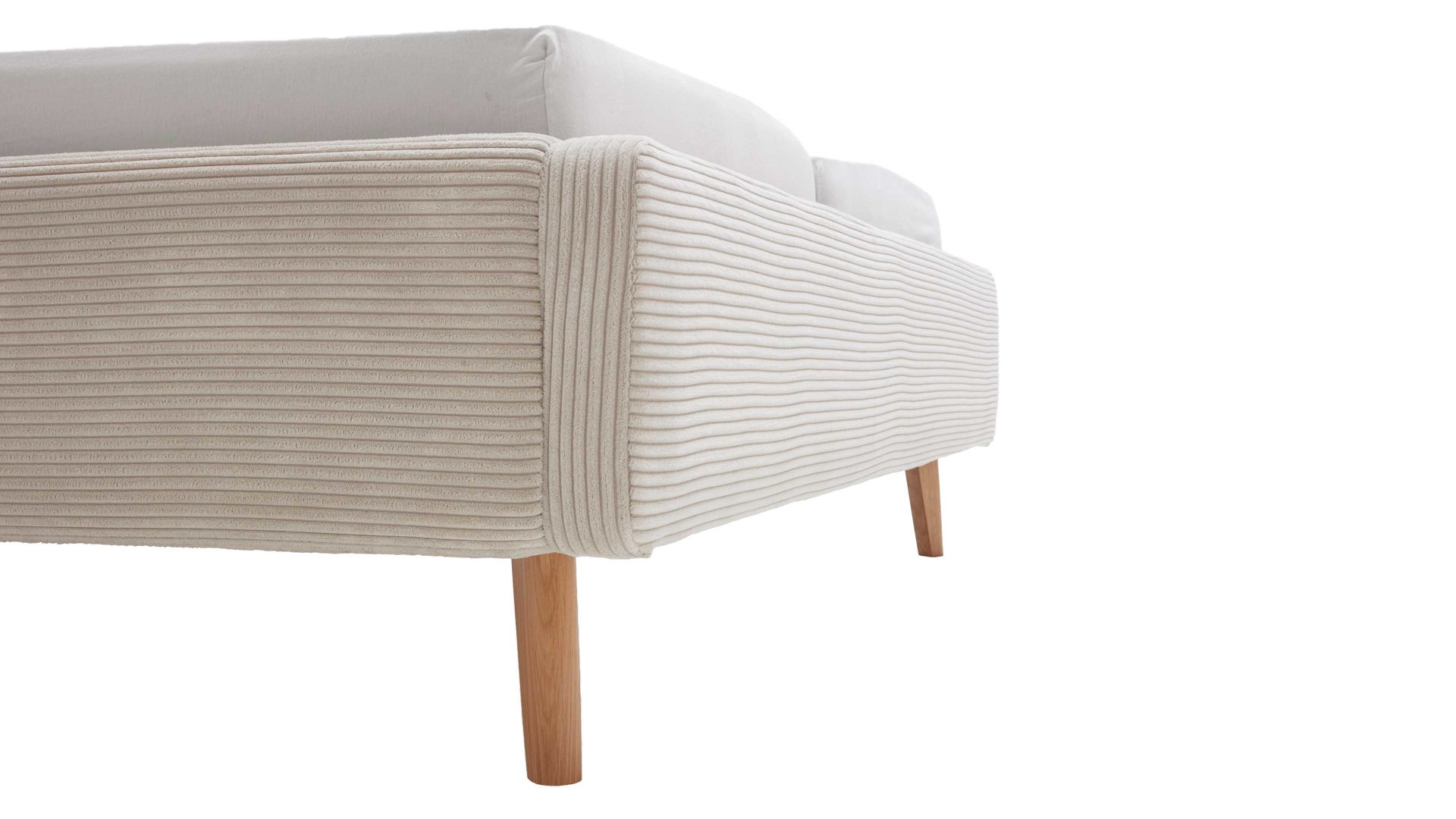 Mit den eichefarbenen Holzfüßen, dem beigen Breitcordbezug und dem belüfteten Bettkasten bringt das Polsterbettgestell Mattis maritimes Flair in Ihr Schlafzimmer.