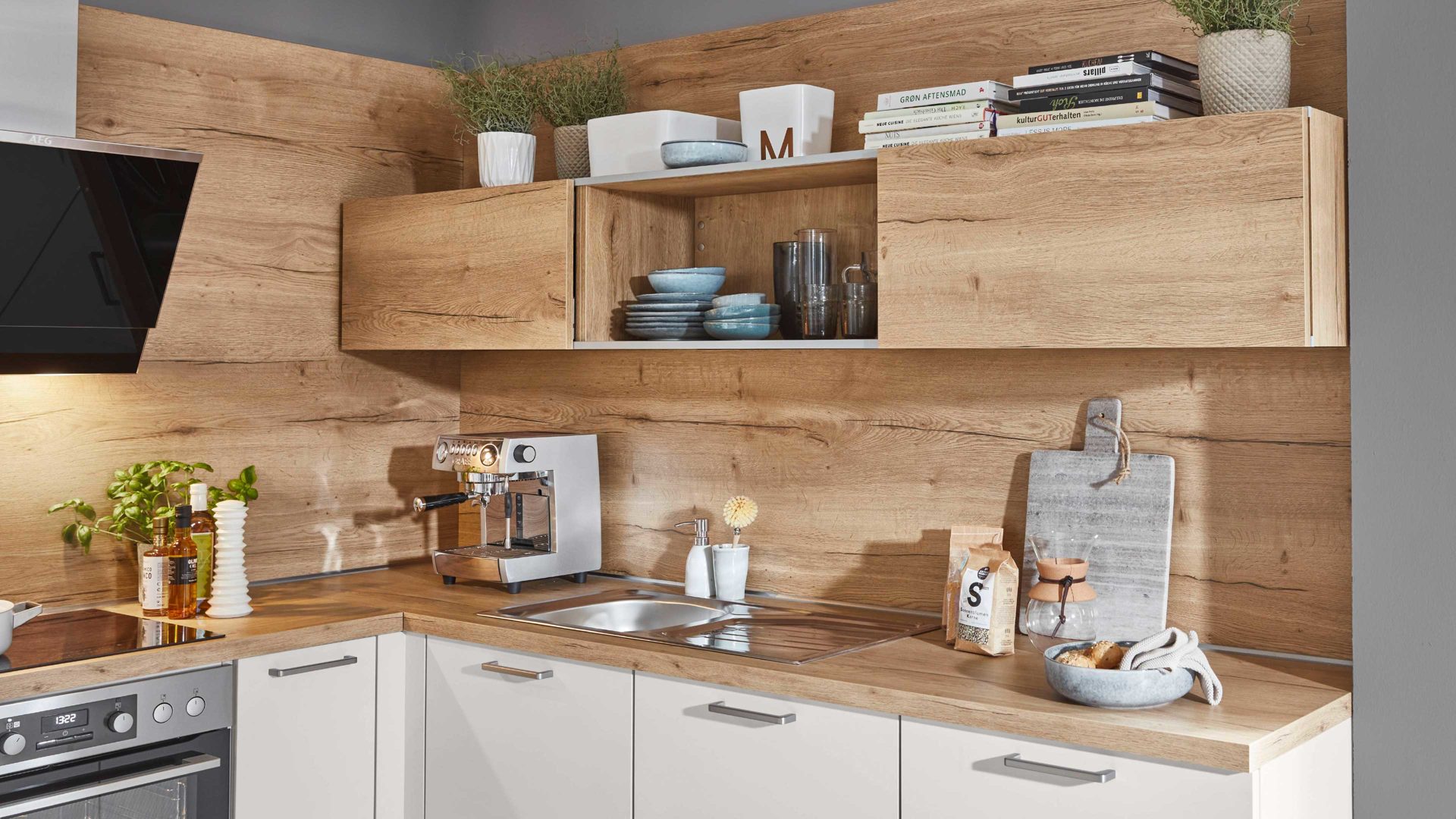 inklusive Nischen- und Rückwandverkleidung und Hängeschränken mit Schiebetüren