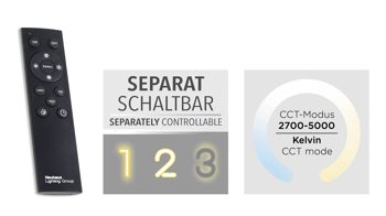 | Verstellbarkeit und Funktion: | dimmbar Fernbedienung Memoryfunktion CCT | Lichtmanagement | |