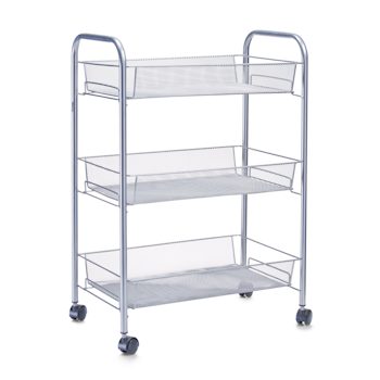 In diesem Küchenwagen aus aluminiumfarbenem pulverbeschichteten Stahldraht findet jeder Ihrer Gegenstände den richtigen Platz. Schaffen Sie eine zufriedenstellende Ordnung und bringen Sie Ihr Geschirr oder Ihre Dekorationsgegenstände in dem Servierwagen unter. Seien Sie kreativ und setzen den Rollwagen auch in Ihrem Badezimmer oder Ihrer Garage ein. Die Einsatzmöglichkeiten sind grenzenlos. Profitieren Sie von der unschlagbaren Flexibilität des Servierwagens, denn mithilfe der vier Lenkrollen haben Sie stets unkomplizierten Zugriff auf Ihre Gegenstände.