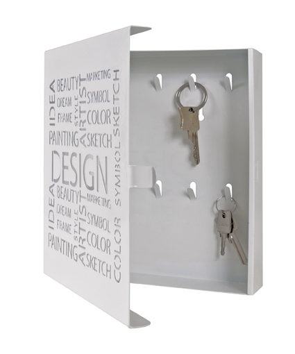 In diesem geschmackvoll gestalteten Schlüsselkasten sind Ihre Schlüssel übersichtlich aufgehoben und bei Bedarf schnell zur Hand. Gleichzeitig ist das exquisite Schlüsselboard in geschlossenem Zustand ein raffiniertes Deko-Objekt für die Wand. Es wirkt mit seinen ausgestanzten Wörtern auf der Vorderseite als attraktiver Blickfang und verleiht seiner Umgebung ein verspieltes, aufgelockertes Flair.