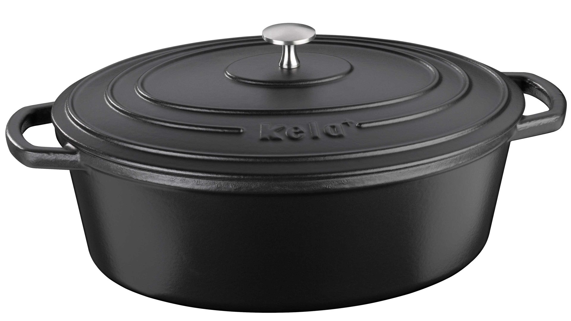 kela Bräter Calido | Gusseisen mit schwarzer Emaille-Beschichtung innen und außen | Größe ca. 33 x 12 x 26 (BxHxT) | Bodenfläche ca. 28 x 20 cm (BxL) | Inhalt ca. 6 Liter | Edelstahl-Deckelknopf | große Griffe | einfache Reinigung | gleichmäßige Hitzeverteilung | gute Wärmespeicherung | energiesparend | perfekt für Anbraten und Schmoren | backofenfest bis 300 Grad Celsius | für alle Herdarten geeignet, auch für Induktion | zehn Jahre Hersteller-Qualitätsgarantie | in verschiedenen Farben und Größen bestellbar