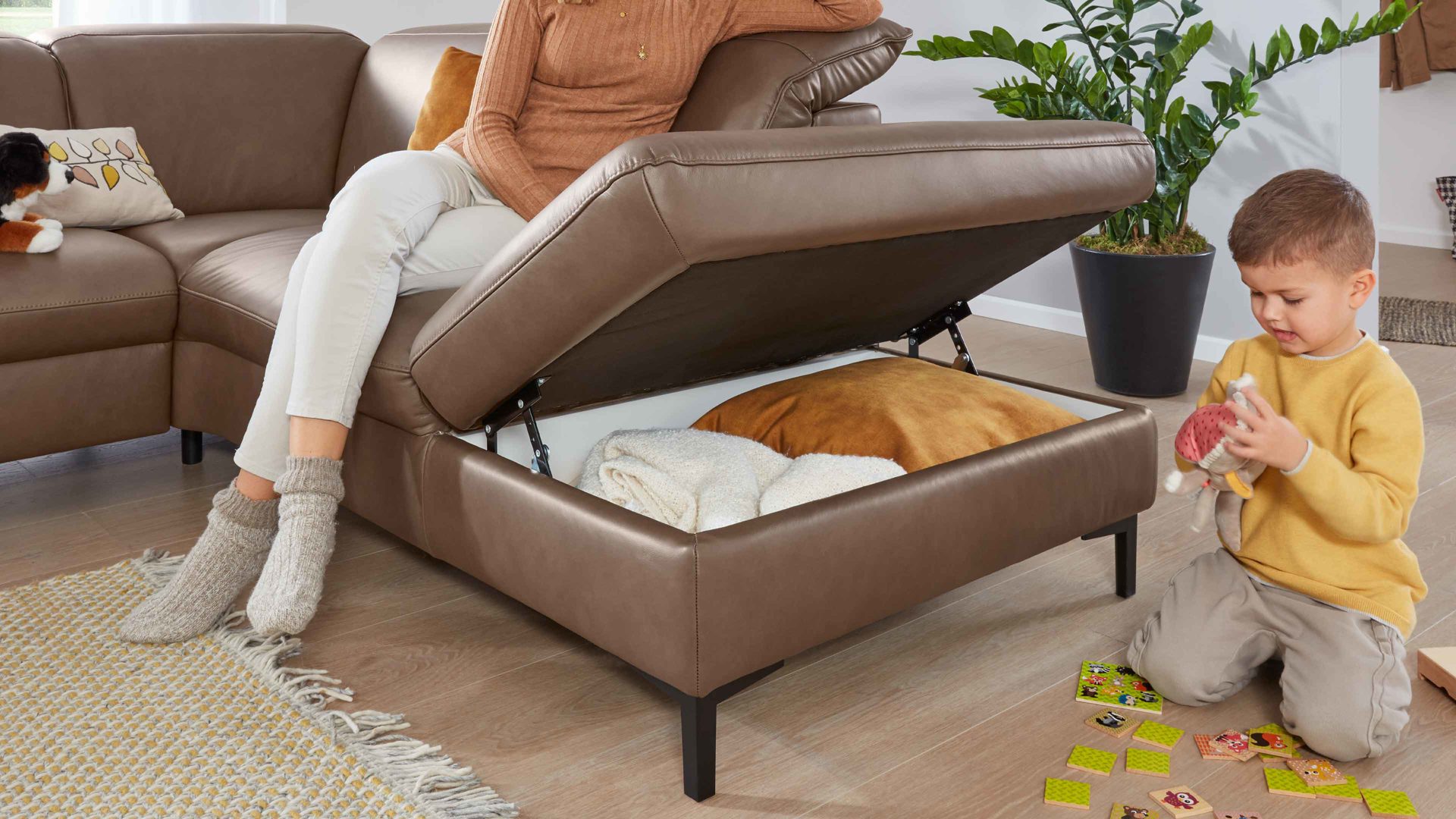 Das Sofaelement lässt sich mittels Rasterbeschlag in mehreren Stufen öffnen. Dabei kommt innen weiß beschichteter und belüfteter Stauraum zum Vorschein. Dieser eignet sich beispielsweise zum Verstauen von Wohntextilien und Spielzeug.
