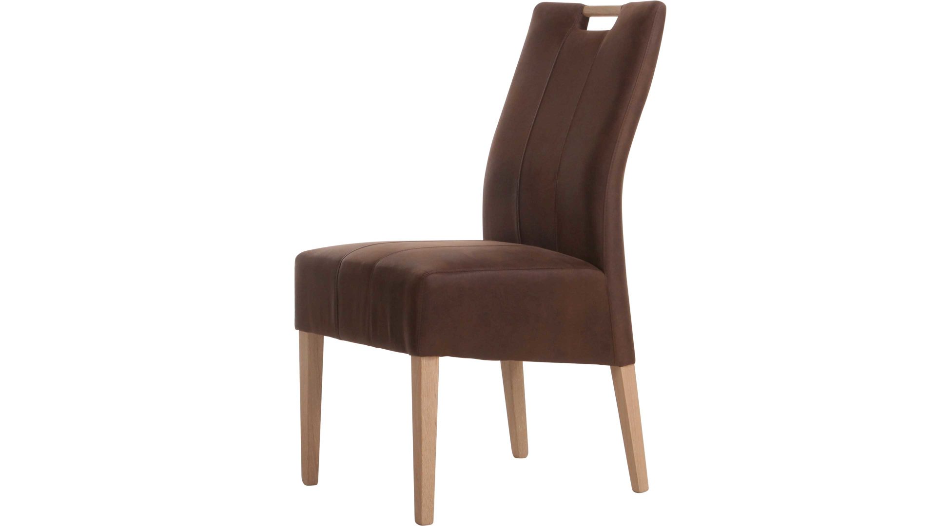 Warm und einladend wirkt der hochwertige Polsterstuhl Vigo mit dunkelbraunem Bezug. Die vier Eichenholzfüße sind Natur lackiert und unterstreichen den schlichten Look des Sitzmöbels genauso wie die Rückenlehne mit Holzgriff. Aufwendige Ziernähte verleihen dem interessanten Design des Polsterstuhls einen zusätzlichen Schliff. Mit den praktischen Maßen von ca. 48 x 96 x 59 cm (BxHxT) findet der Vierfußstuhl auch an kleineren Tischen Platz.