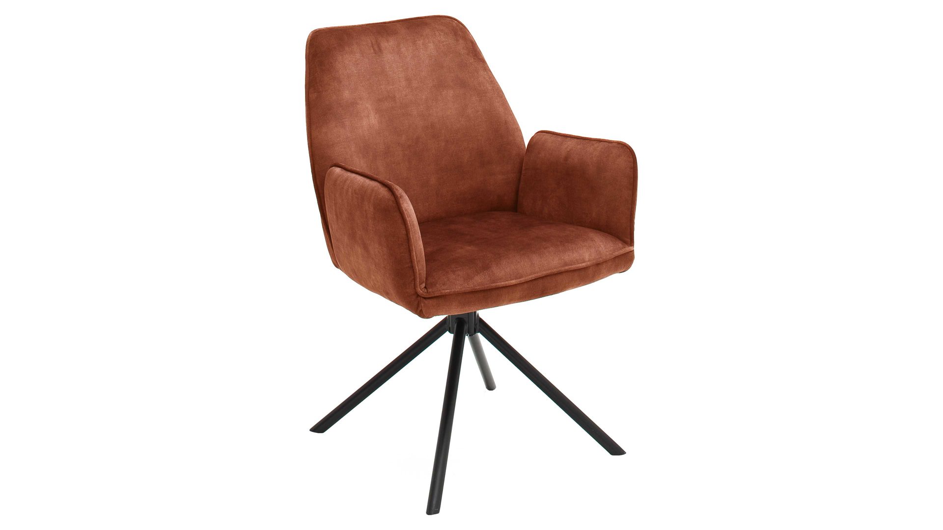 Der Armlehnen-Vierfußstuhl Ottawa kommt in einem ausdrucksstarken Design: Seine Sitzschale inklusive der gepolsterten Armlehnen ist komplett in einer edlen Vintage-Veloursoptik gehalten. Entlang aller Kanten ist der Stuhl mit Keder verstärkt. Der Velours in sanftem Rostbraun trifft auf vier mattschwarz lackierte Metallfüße. Einen spannenden Kontrast bildet die softe Oberfläche zu der geradlinigen Formensprache.